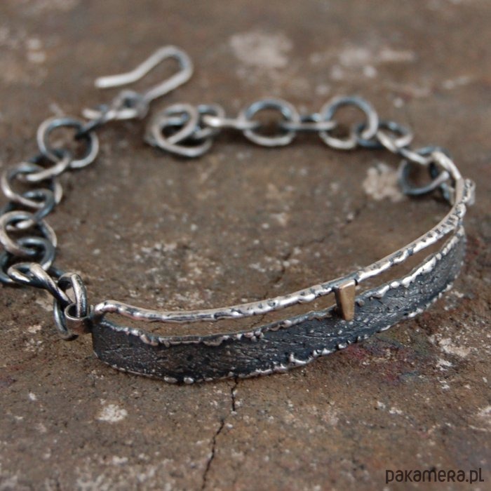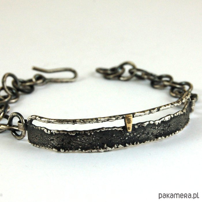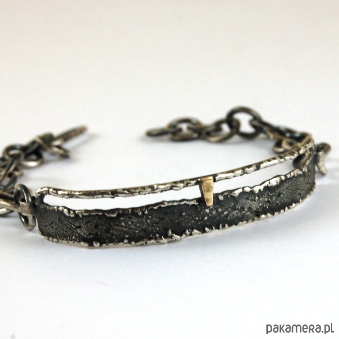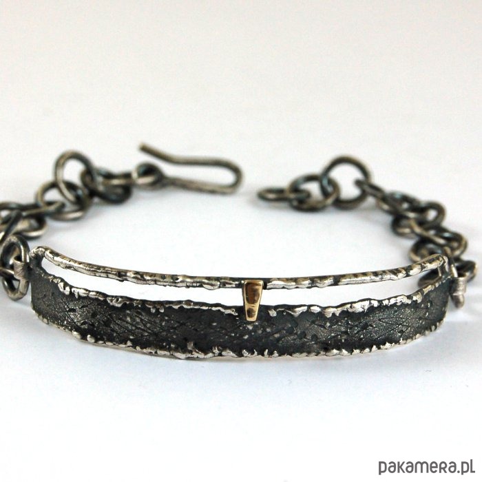 Bransoleta z oksydowanego srebra i złota próby 585. Łańcuch wykonany ręcznie - wielkość ogniw ok. 0,9 cm. Szerokość bransolety 1,2 cm. Proszę o podanie obwodu nadgarstka.