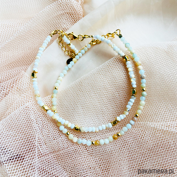 W skład zestawu wchodzą 4 bransoletki: 2 z masy perłowej, 1 amazonit, 1 hematyt ( pokazane na 1 zdjęciu)