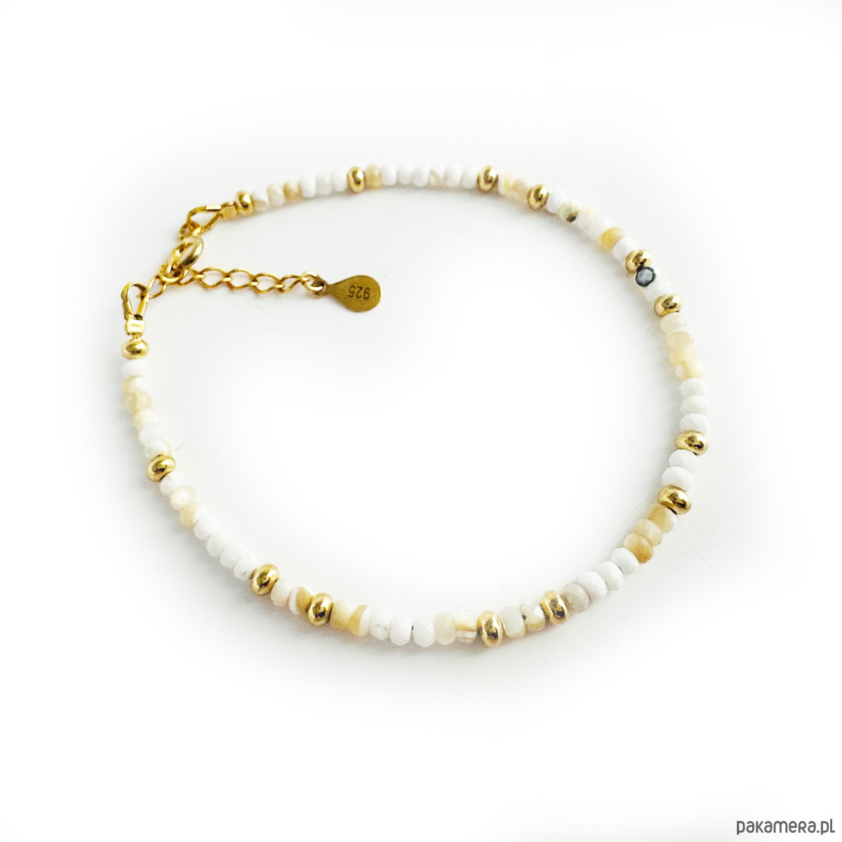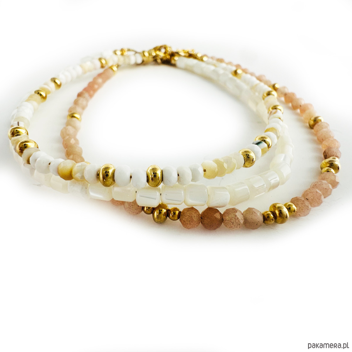 W skład zestawu wchodzą 3 bransoletki: 2 z masy perłowej, 1 z kamienia słonecznego.