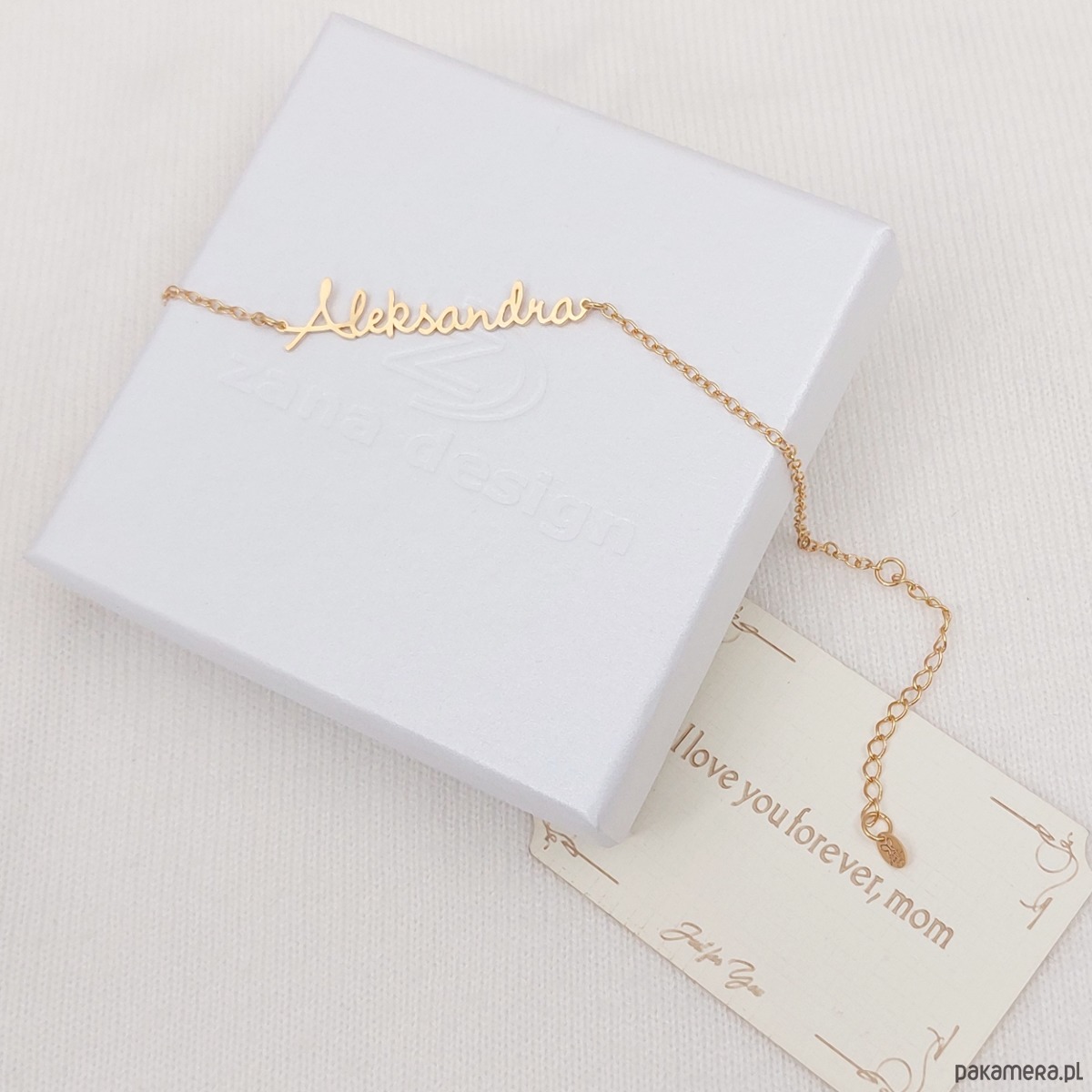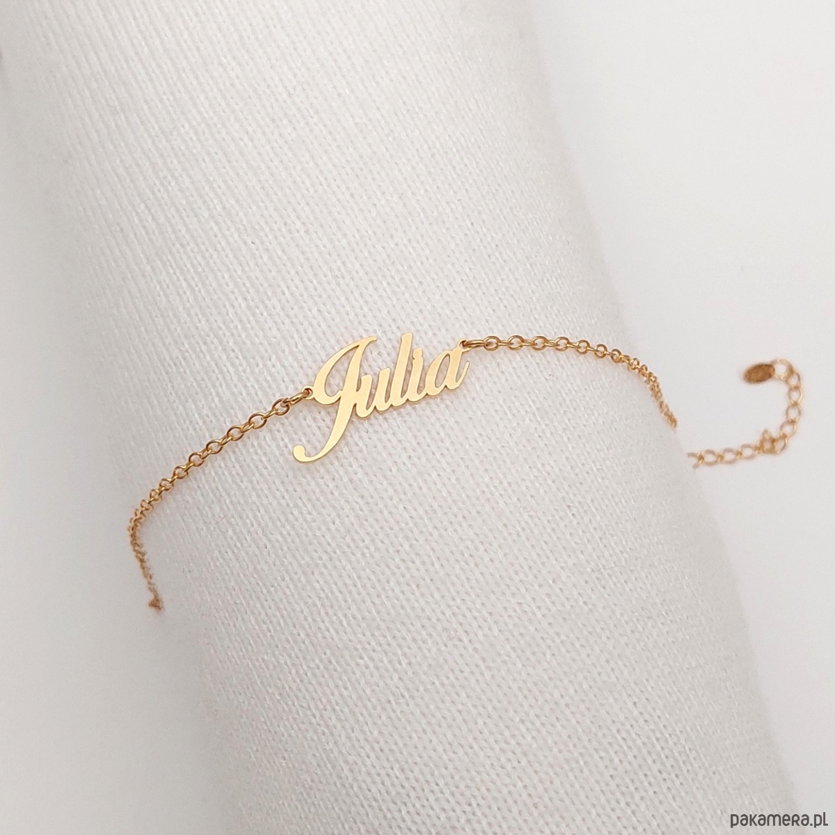 Modna złota bransoletka z dowolnym imieniem lub słowem.