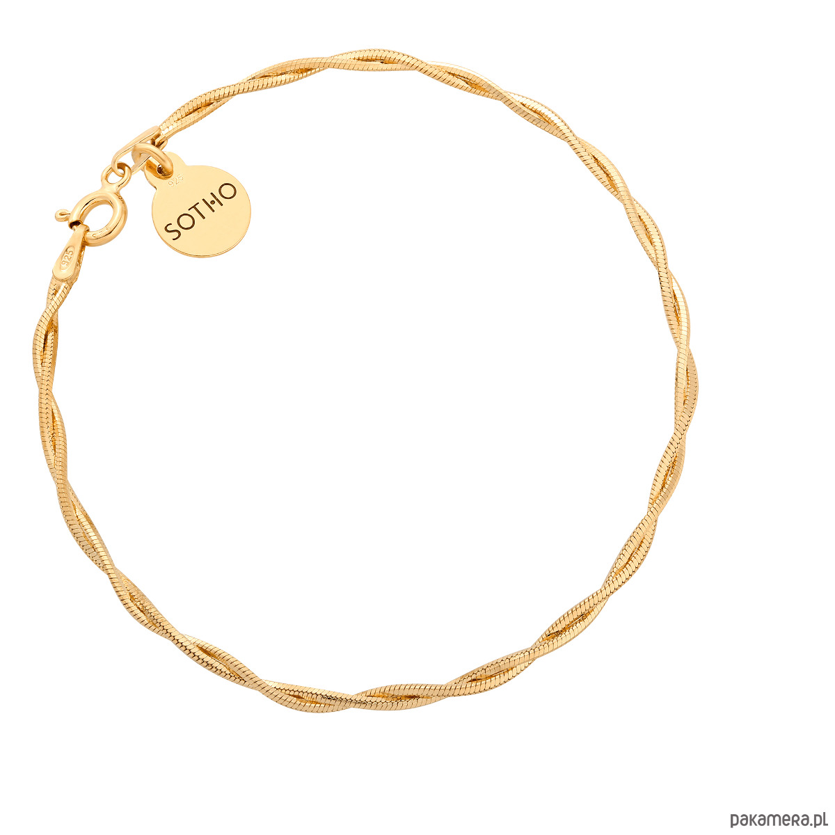 Złota bransoletka łańcuszkowa typu snake pleciony z zawieszką z logo marki. Całość wykonana ze srebra 925 powlekanego 24 karatowym żółtym złotem.