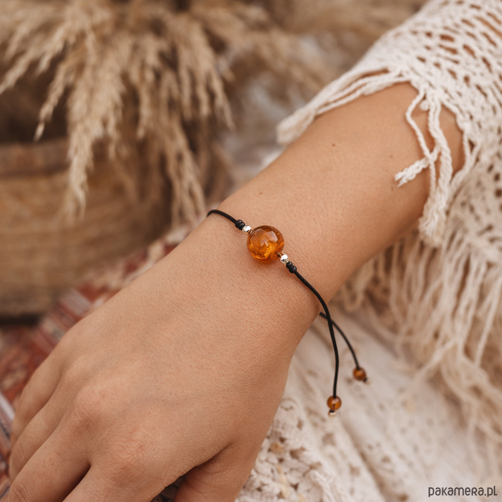 Minimalistyczna bransoletka wykonana z naturalnego bursztynu bałtyckiego. Osadzona na wytrzymałym sznurku nylonowym z regulowanym zapięciem. Przekładki z hematytu. Lekka i wygodna w noszeniu, odpowiednia na co dzień.