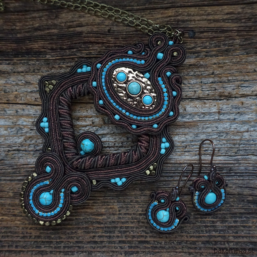 Składa się z dużego, efektownego wisiora oraz delikatnych kolczyków utrzymanych w harmonii barw brązu i turkusu.