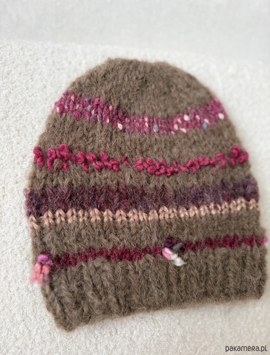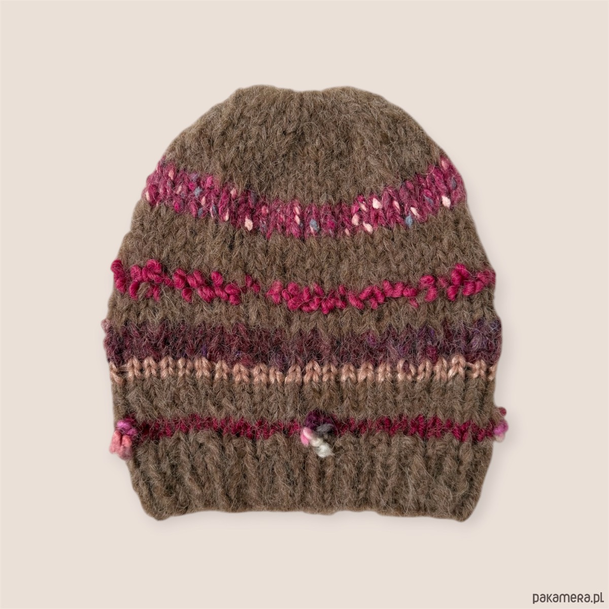 Czapka z delikatnej, miękkiej włóczki. baza to 74% alpaka 25% merino 4% poliamid. W ozdobnych paskach merino, alpaka, akryl.