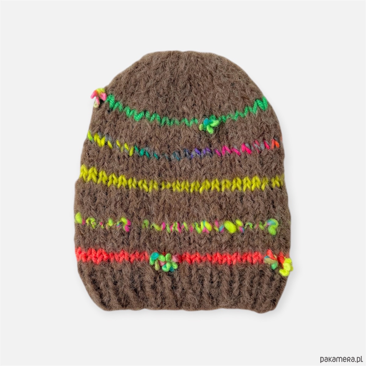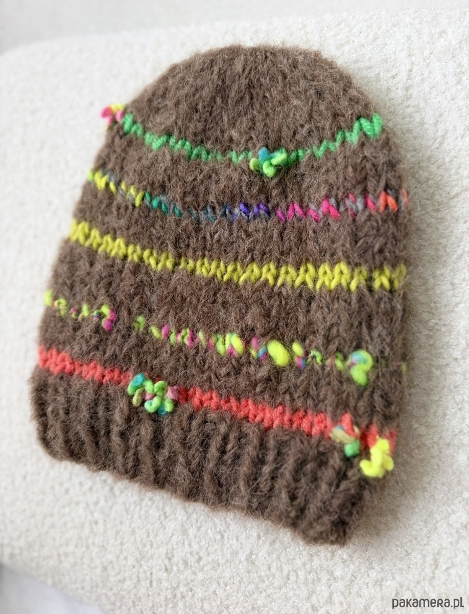 Czapka z delikatnej, miękkiej włóczki. baza to 74% alpaka 25% merino 4% poliamid. W ozdobnych paskach merino, alpaka, akryl.