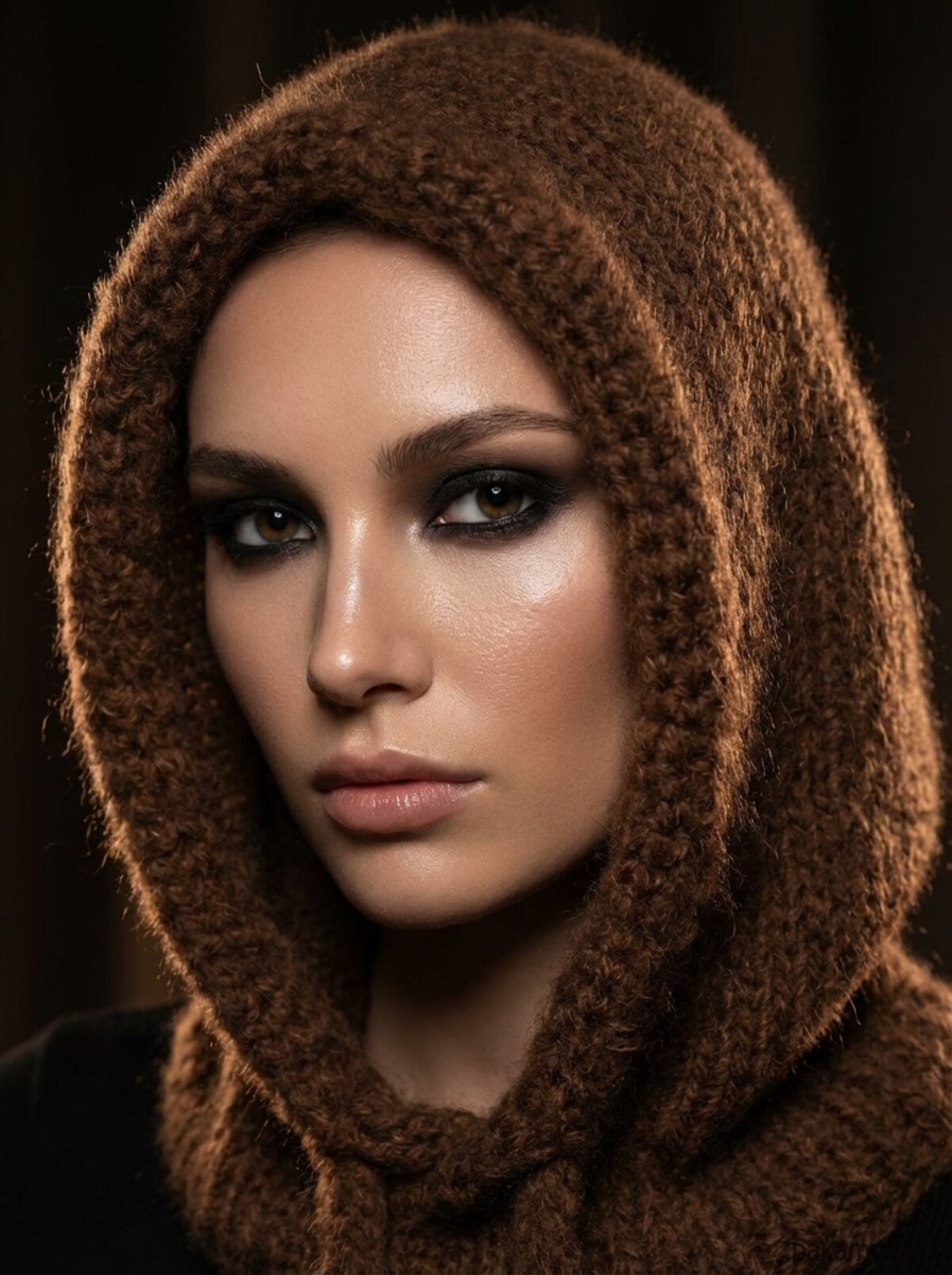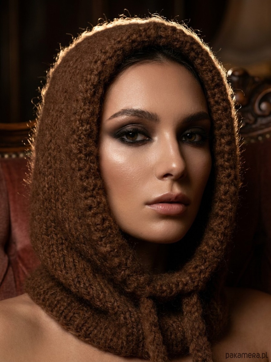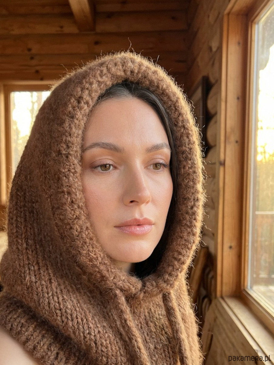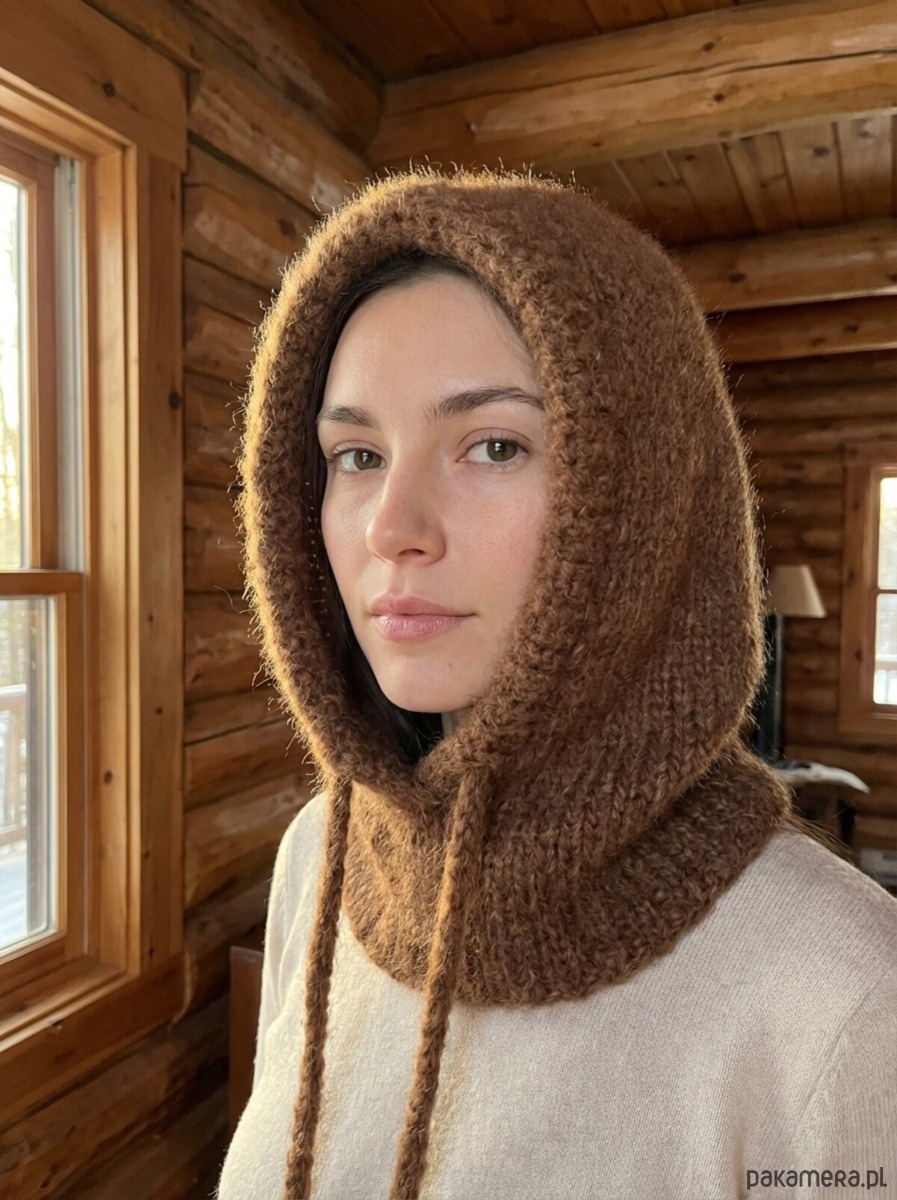 Brązowa balaclava ręcznie dziergana z kid mohairu i baby alpaki. Lekka jak mgła, a jednocześnie ciepła i otulająca. Obwódka dookołą z podwójnej przędzy dodaje szyku, a elastyczne ściągacze umożliwiaja wygodne dopasowanie, zapewniając komfort noszenia.To idealny wybór dla osób, które cenią wysoką jakość styl i funkcjonalność w jednym.Naturalny kolor, miękkość włókien i spokojny rytm ręcznej pracy tworzą formę która chroni przed chłodem i stanowi stylowy akcent w każdej stylizacji.