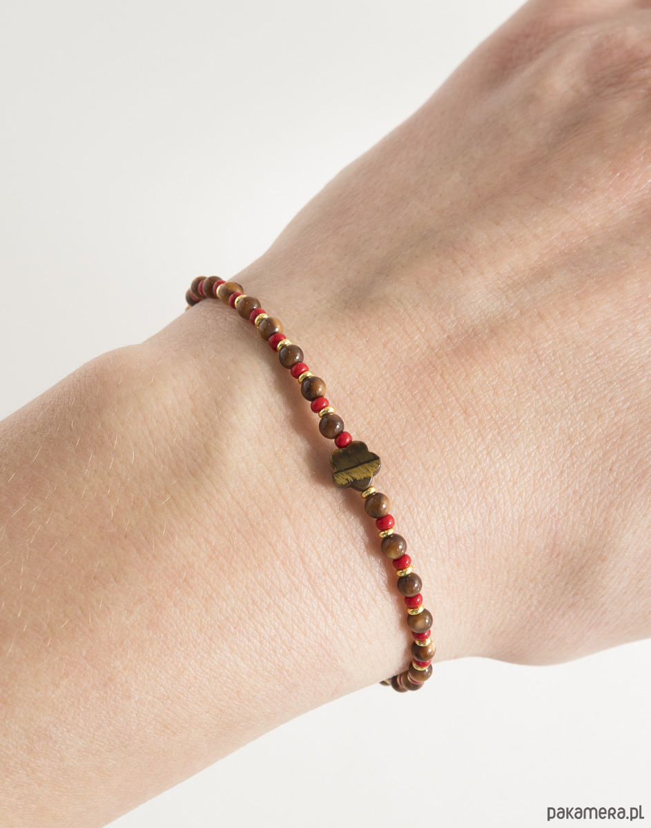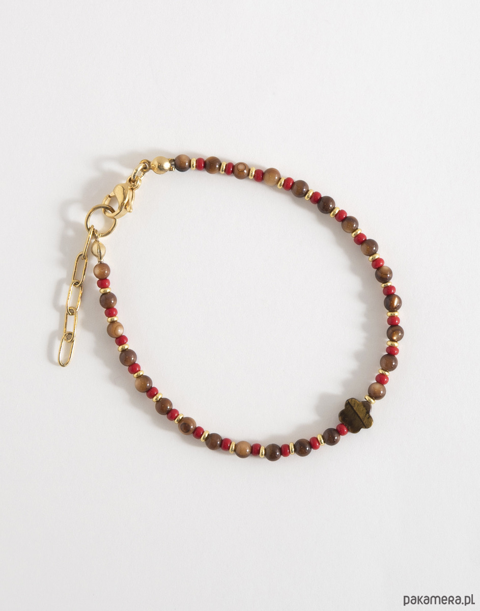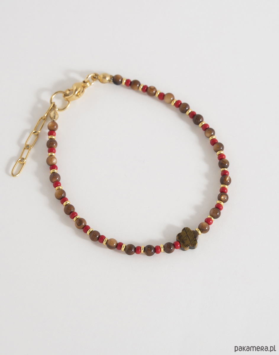 Bransoletkę wykonano ręcznie z brązowej masy perłowej, przeplatanej szklanymi koralikami w kolorze złotym i czerwonym. Centralnym elementem jest kwiatek z tygrysiego oka. Bransoletka posiada regulację, dzięki czemu łatwo dopasować ją do nadgarstka.