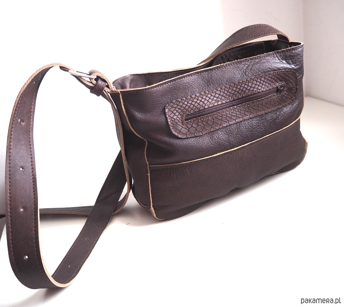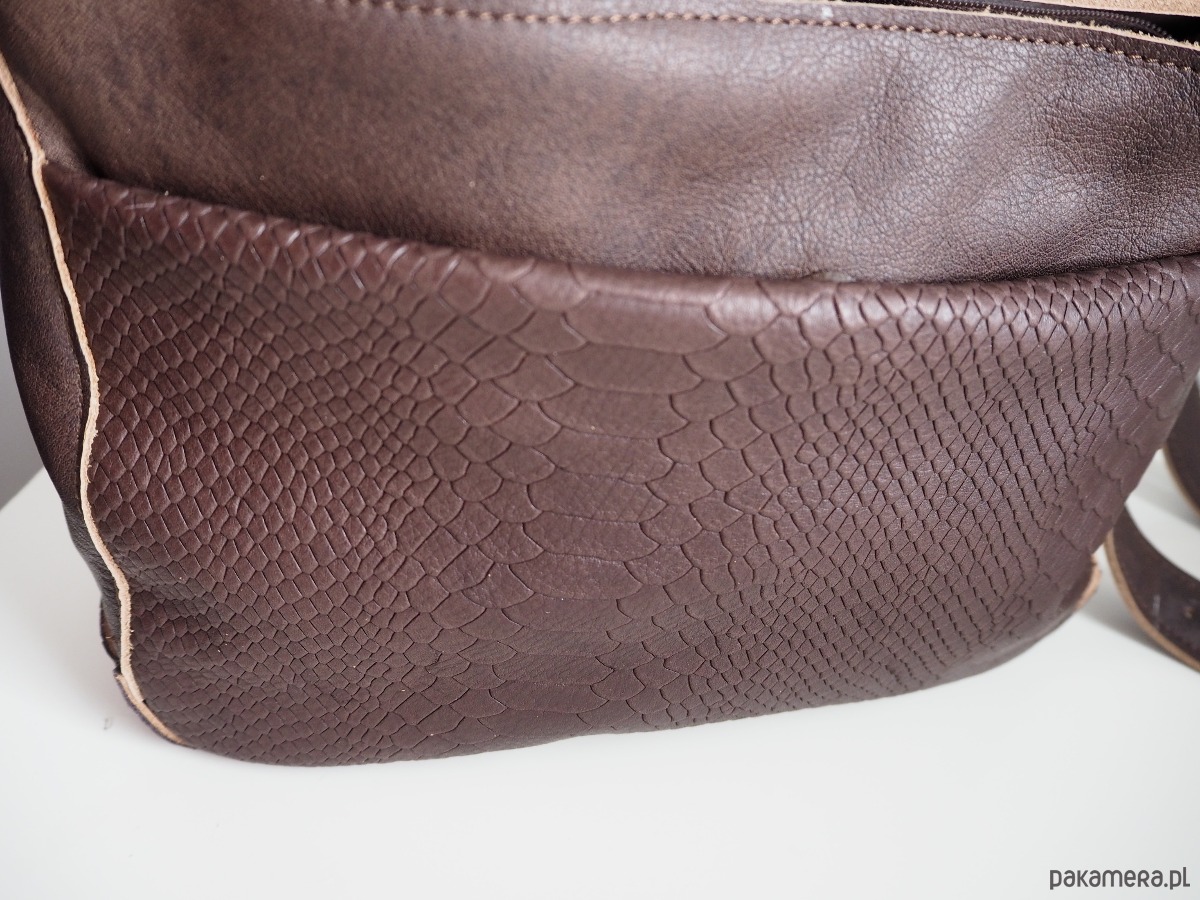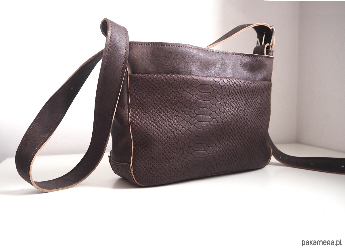 Czekoladowa brązowa skórzana torebka. Z przodu duża kieszonka ze skóry z tłoczeniem w węża.