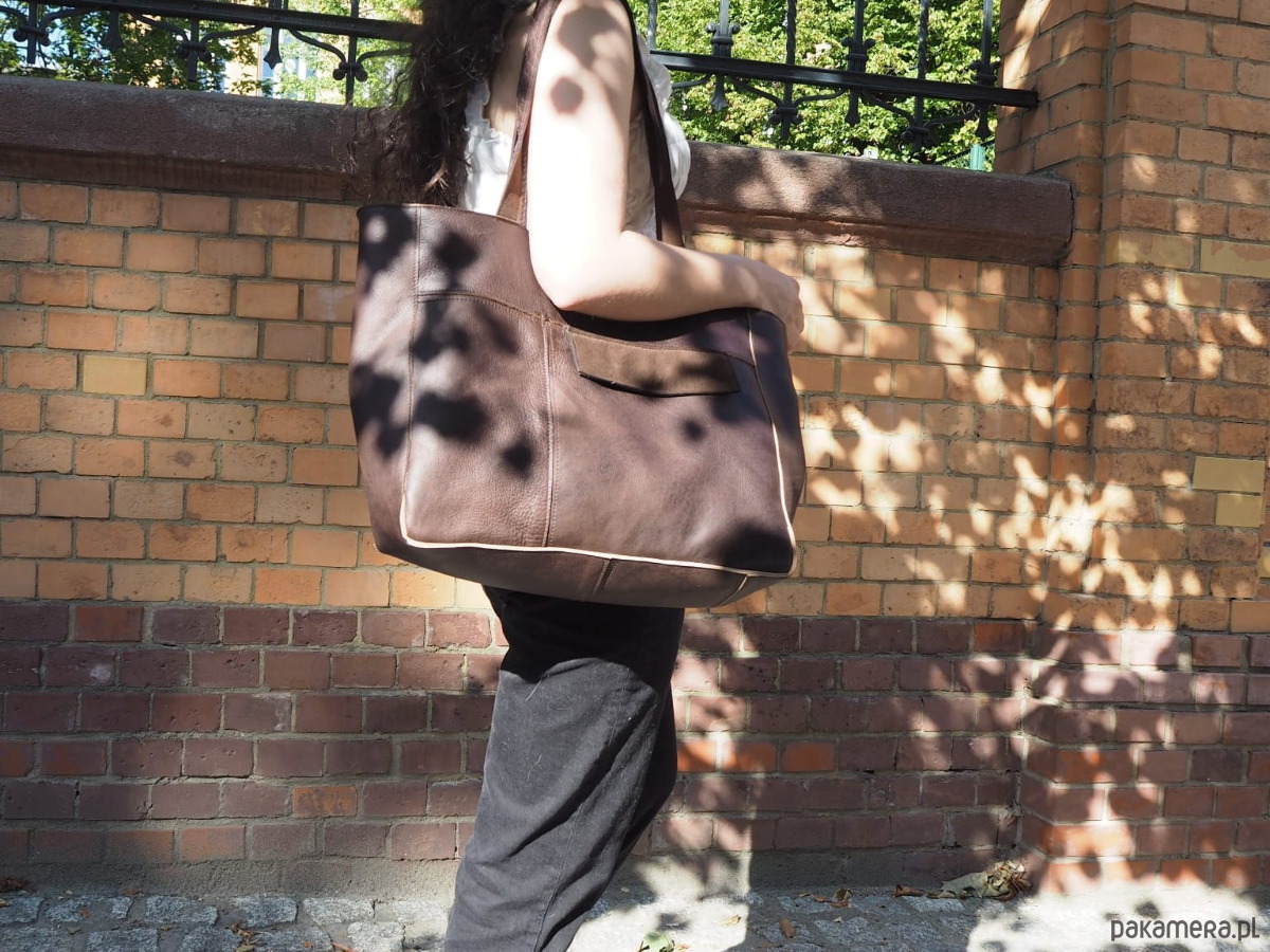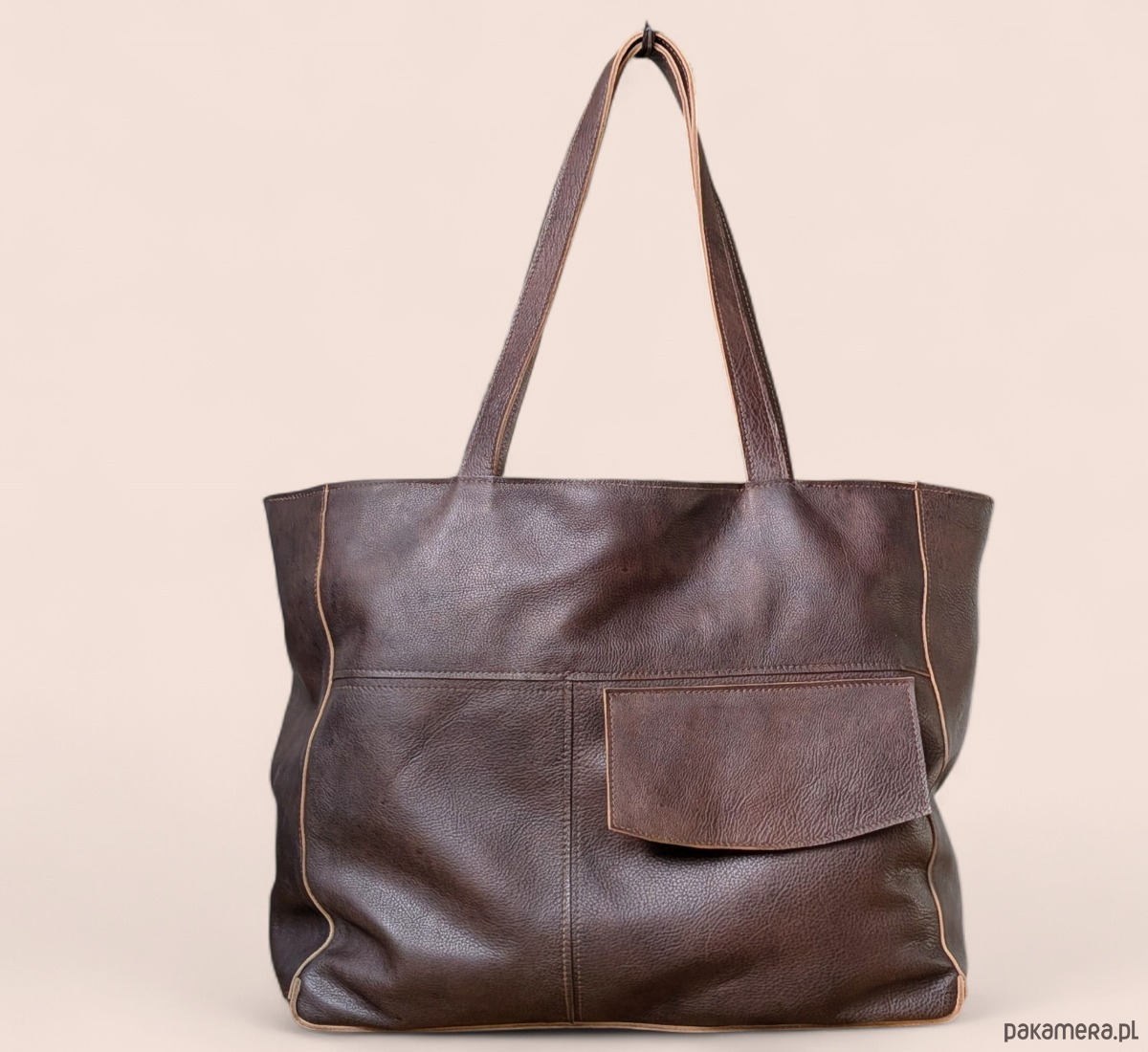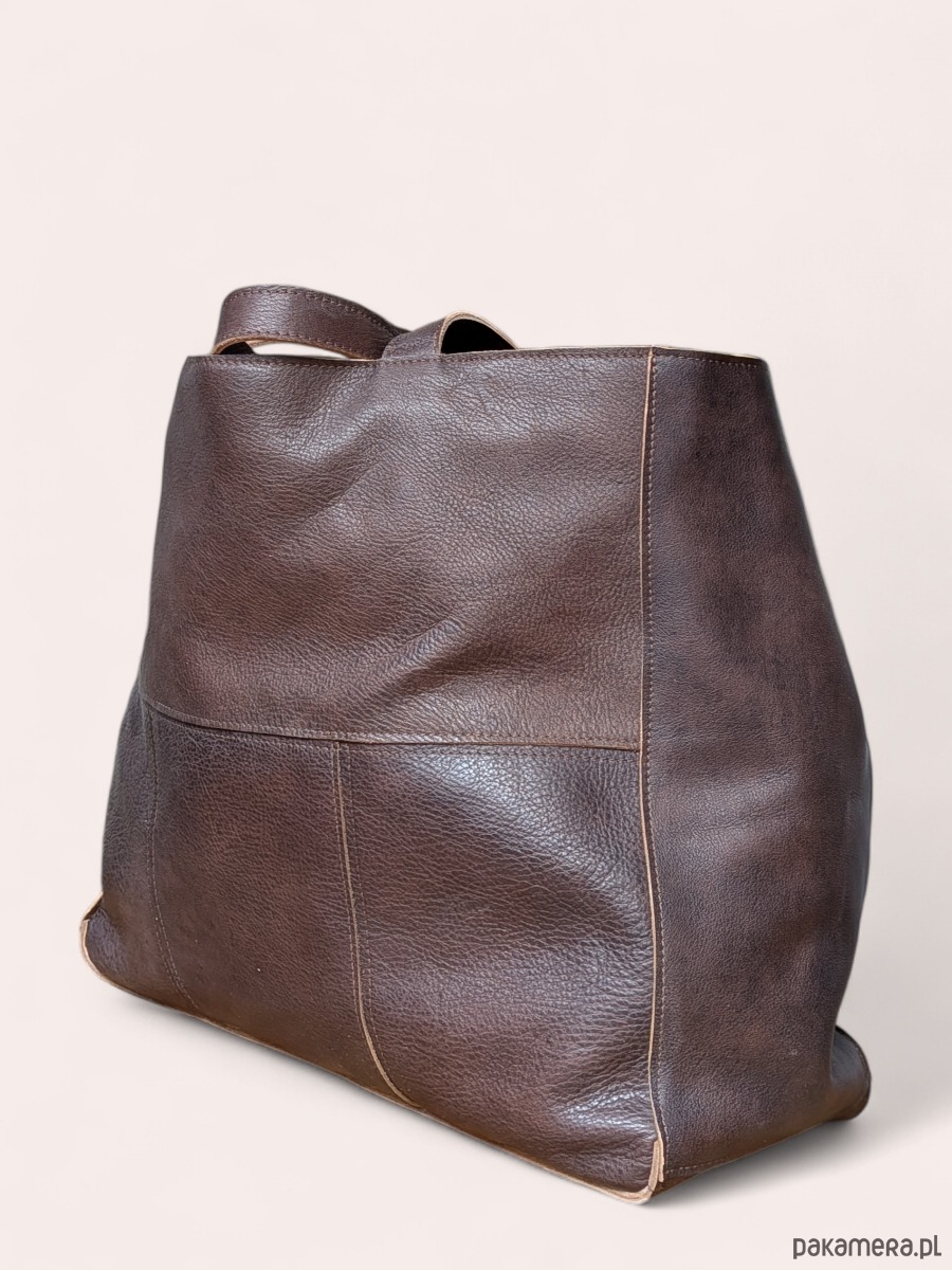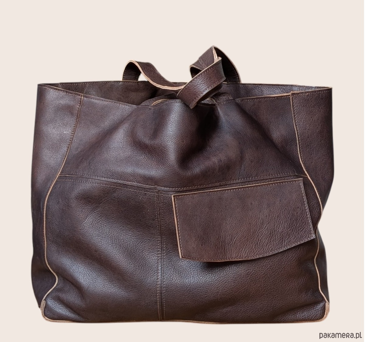 Bardzo duża skórzana torba w odcieniu czekoladowego brązu.