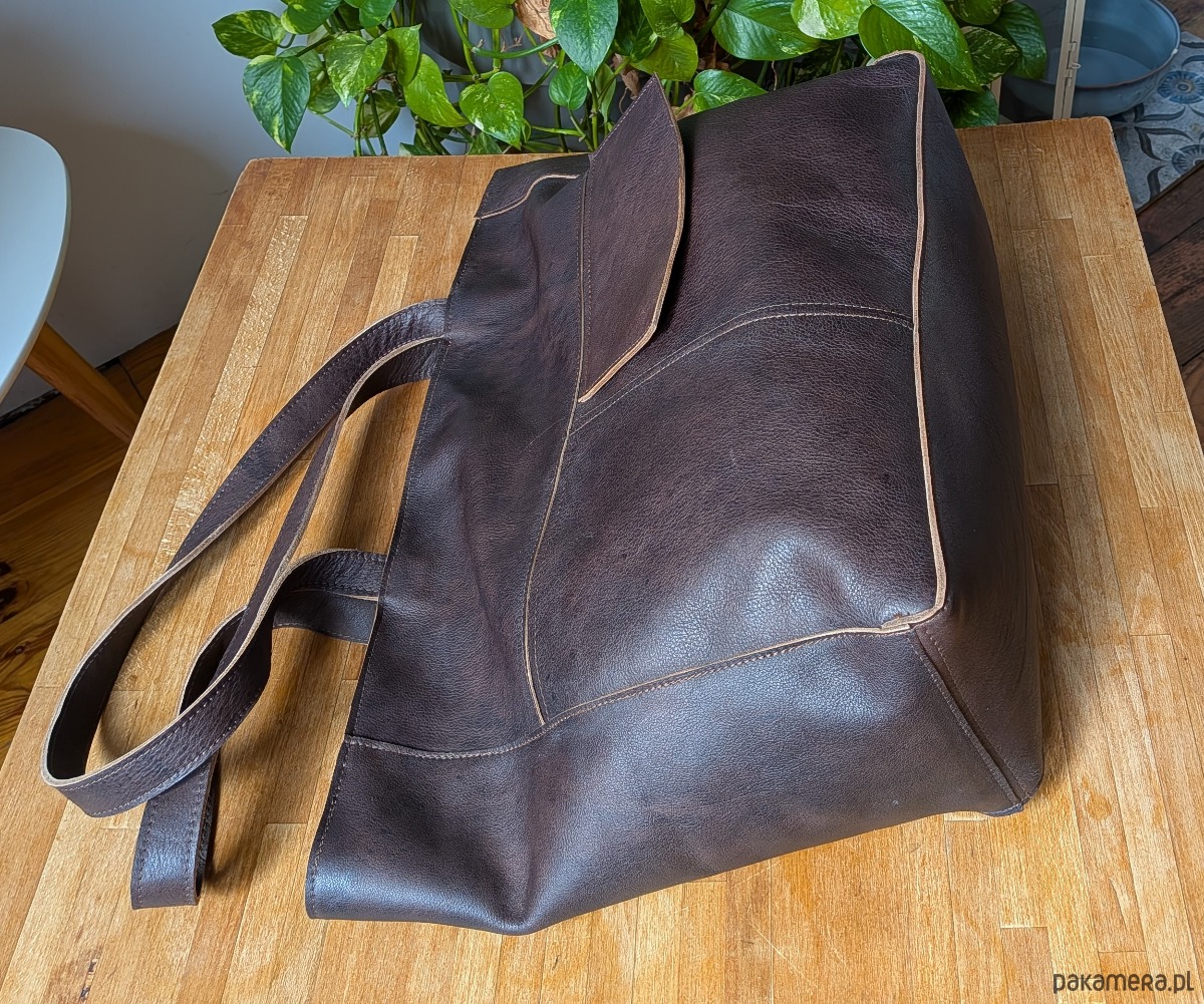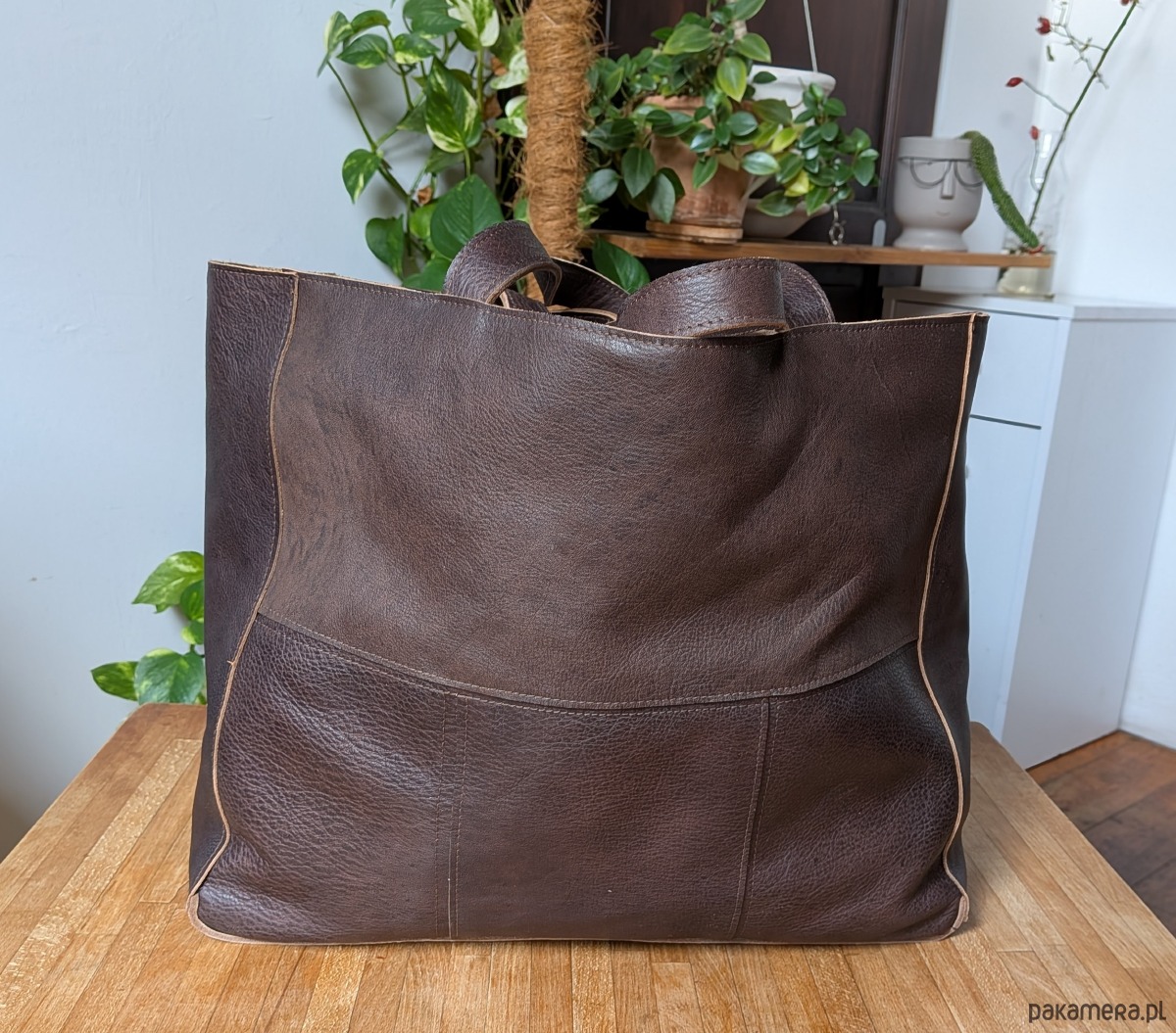 Bardzo duża skórzana torba w odcieniu czekoladowego brązu.