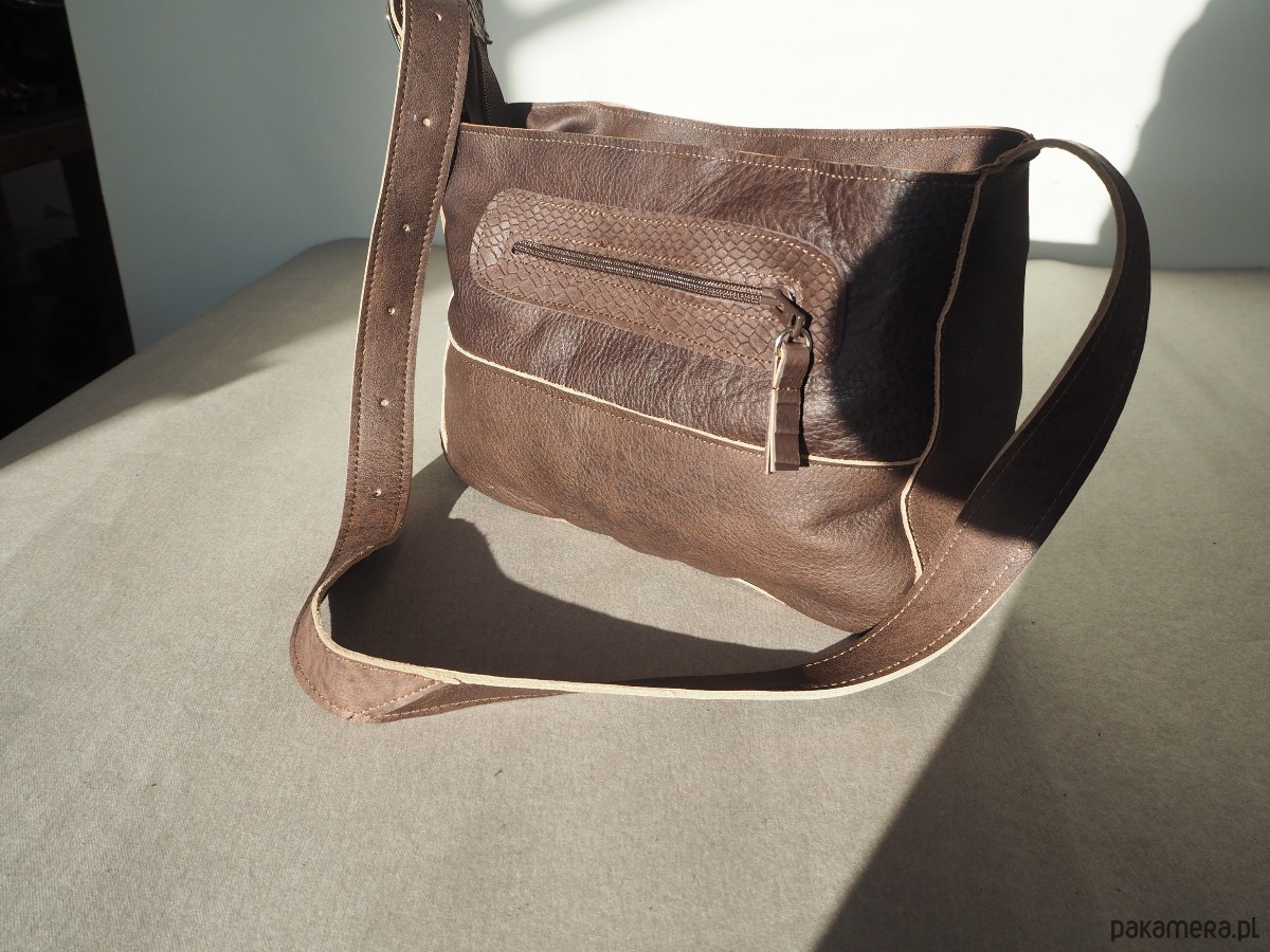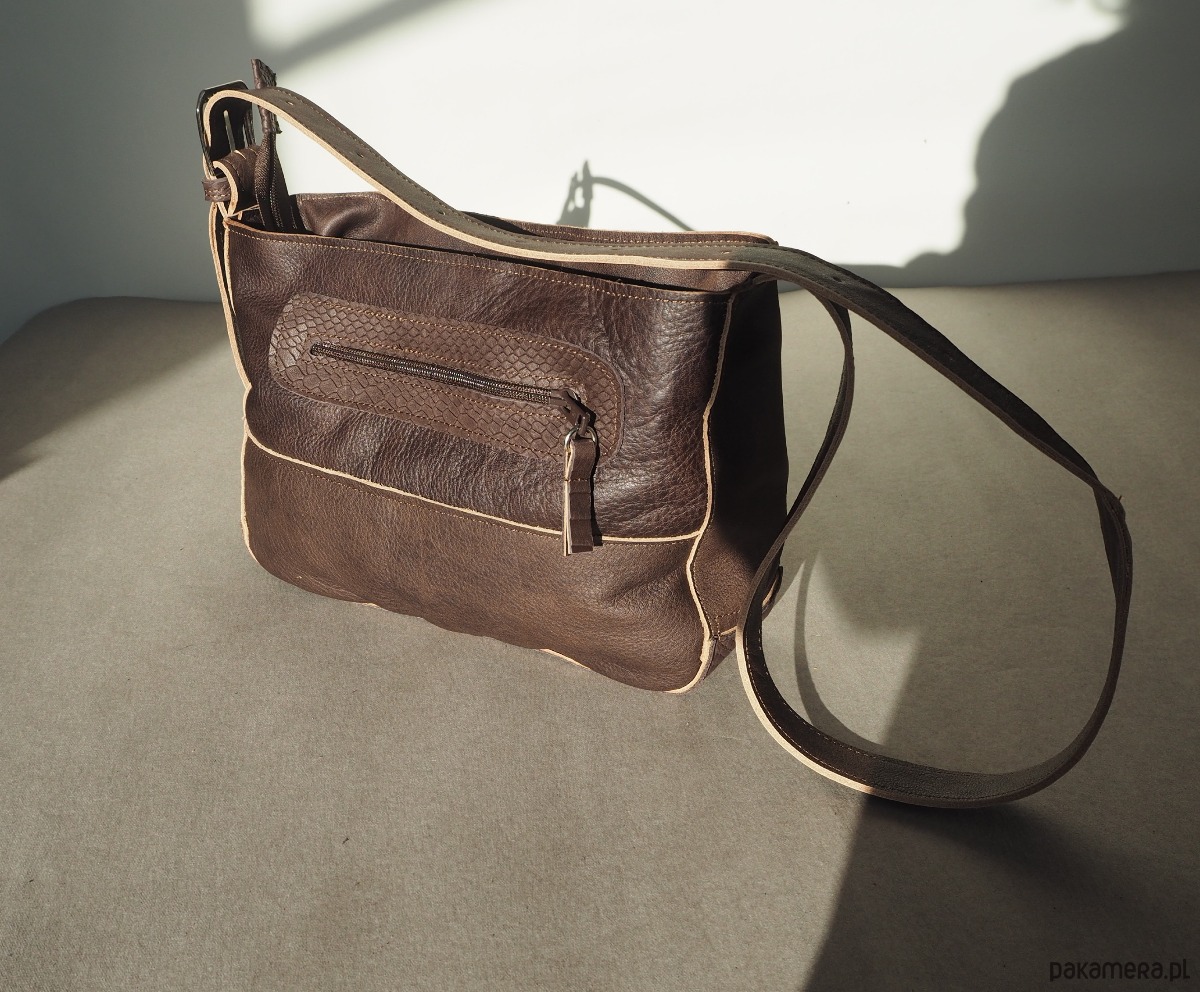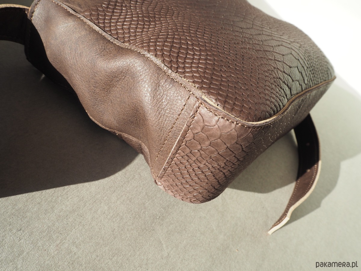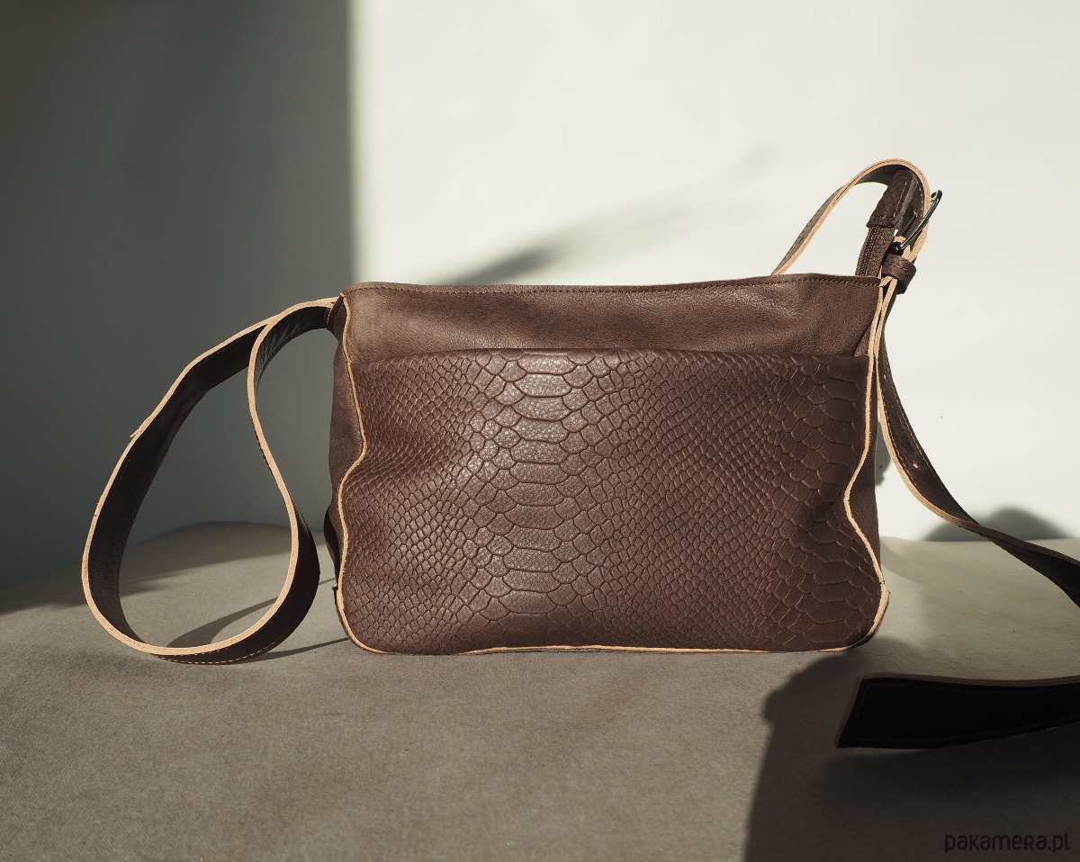 Czekoladowa brązowa skórzana torebka. Z przodu duża kieszonka ze skóry z tłoczeniem w węża.