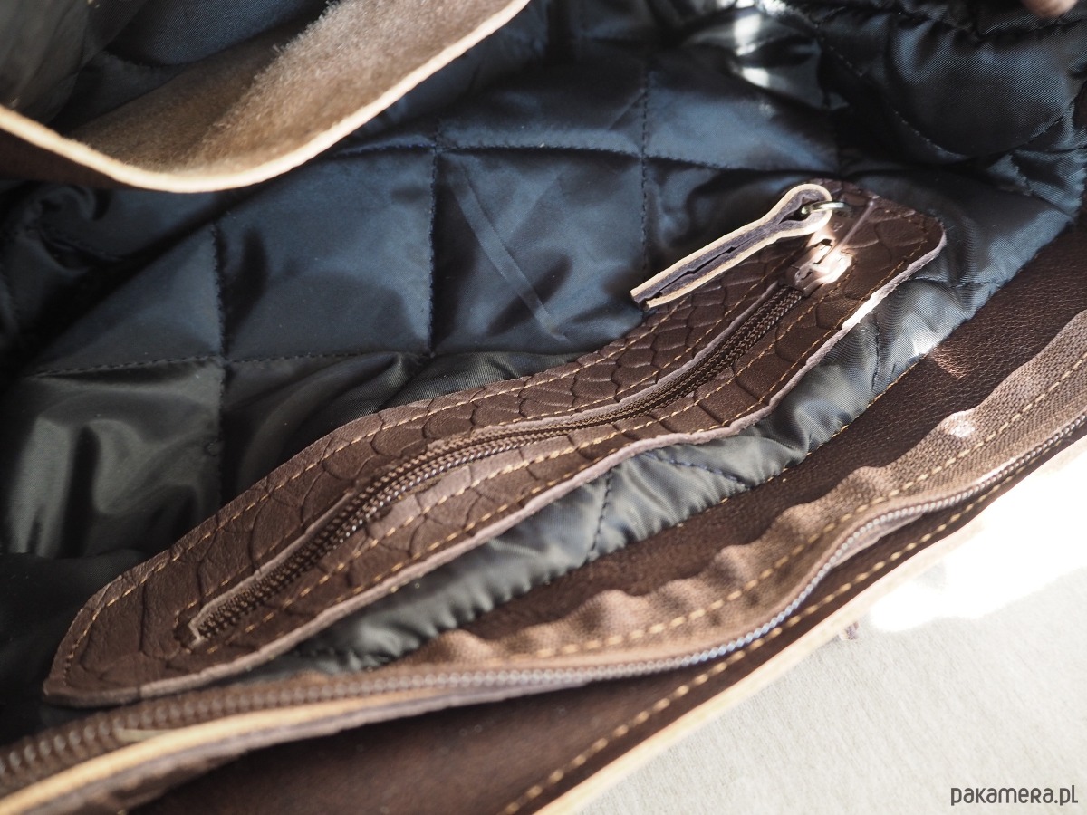 Wewnątrz podszewka z czarnej pikówki, która powoduje, że torebka jest bardziej puchata i trzyma formę., w środku kieszonka na zamek i kieszonka na telefon