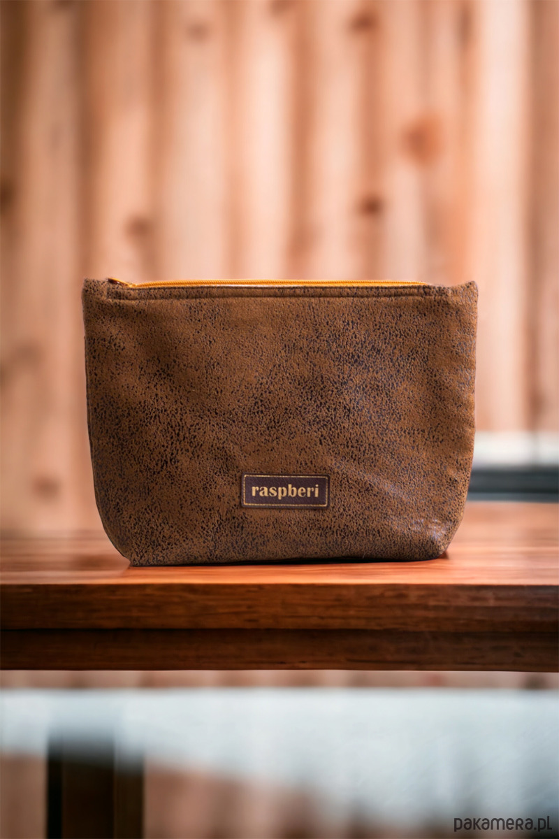 Duża kosmetyczka wykonana z nubuku imitującego postarzaną skórę w kolorze brązowym.