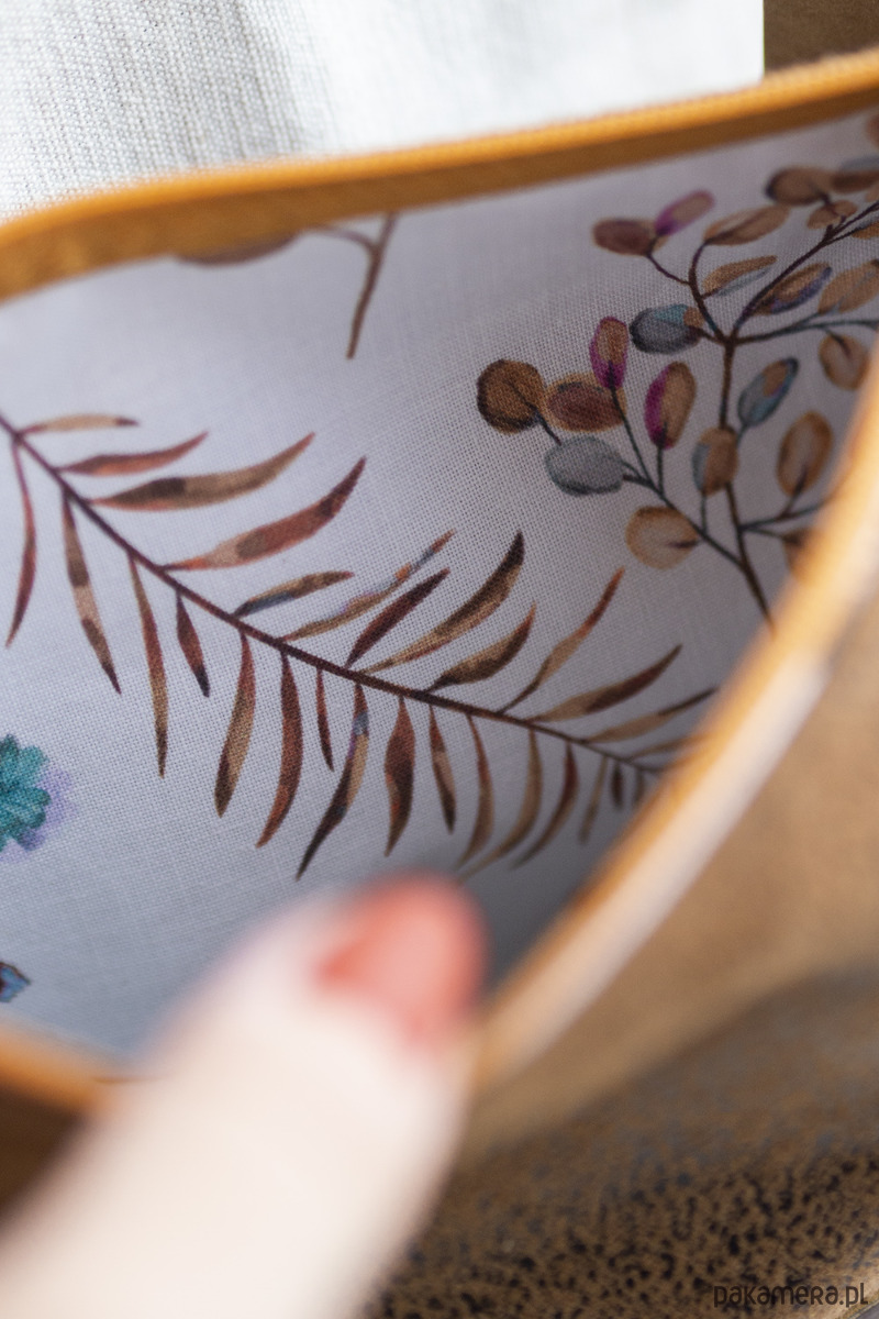 Kosmetyczka jest zapinana na suwak, w środku wszyta biała, bawełniana podszewka w kwiaty.