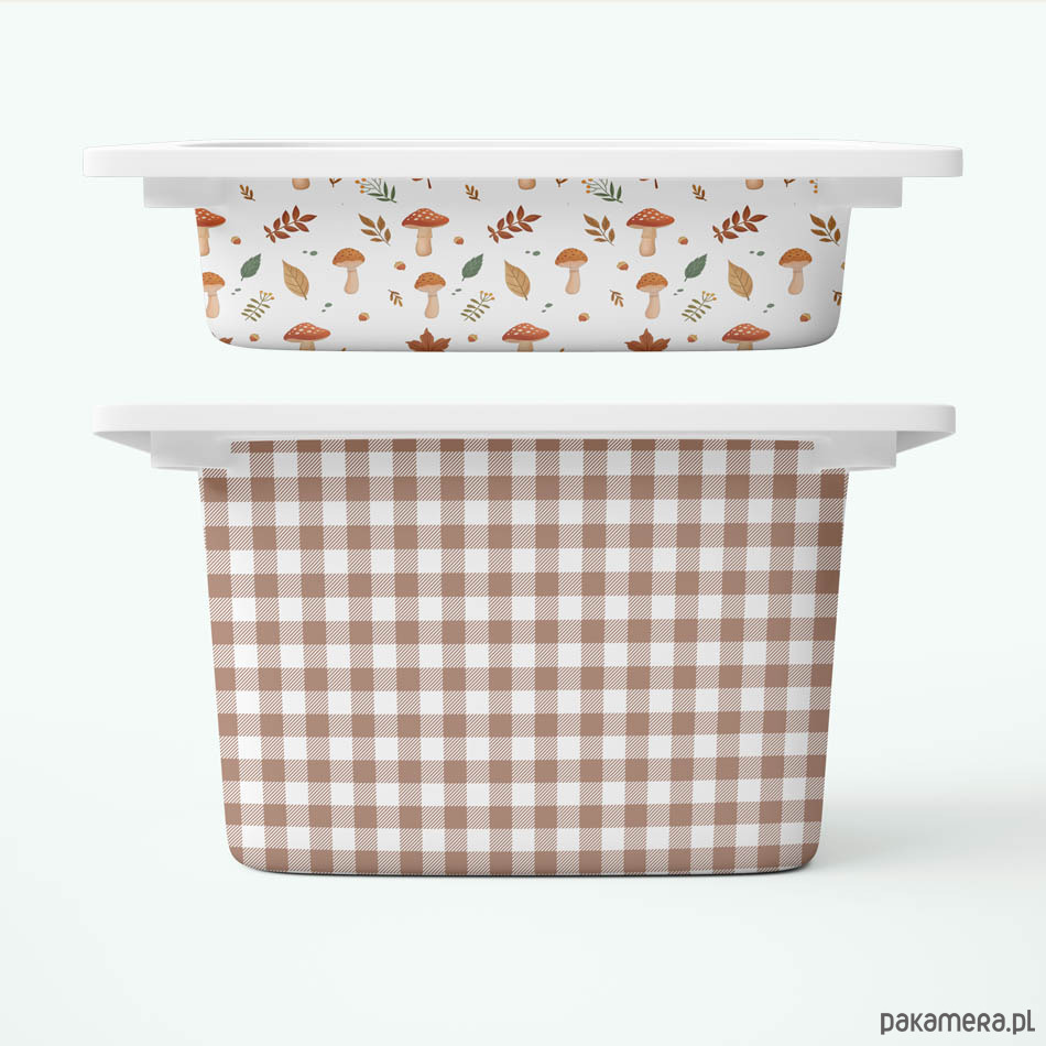 Brązowa kratka i grzybki - naklejki na pojemniki na zabawki