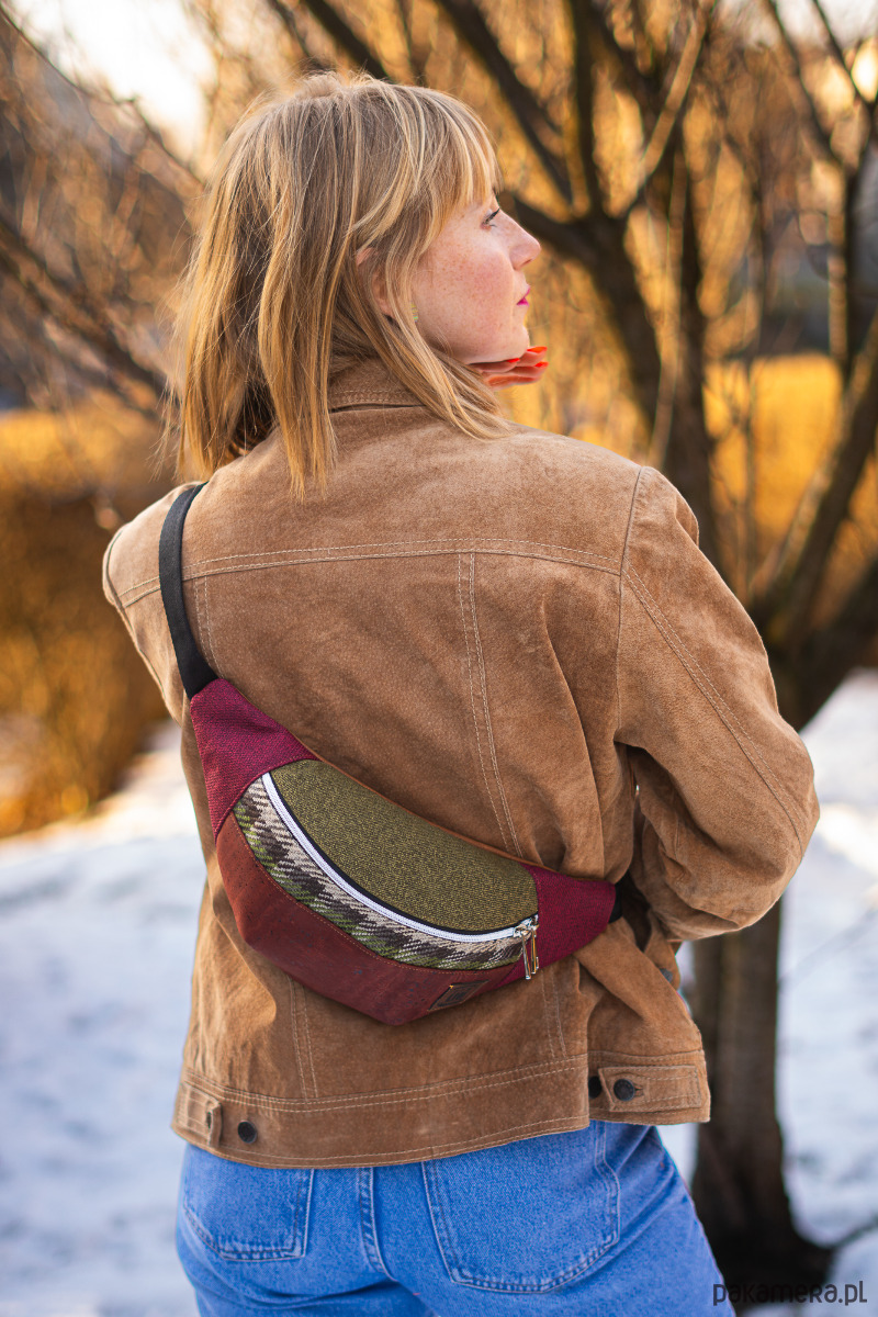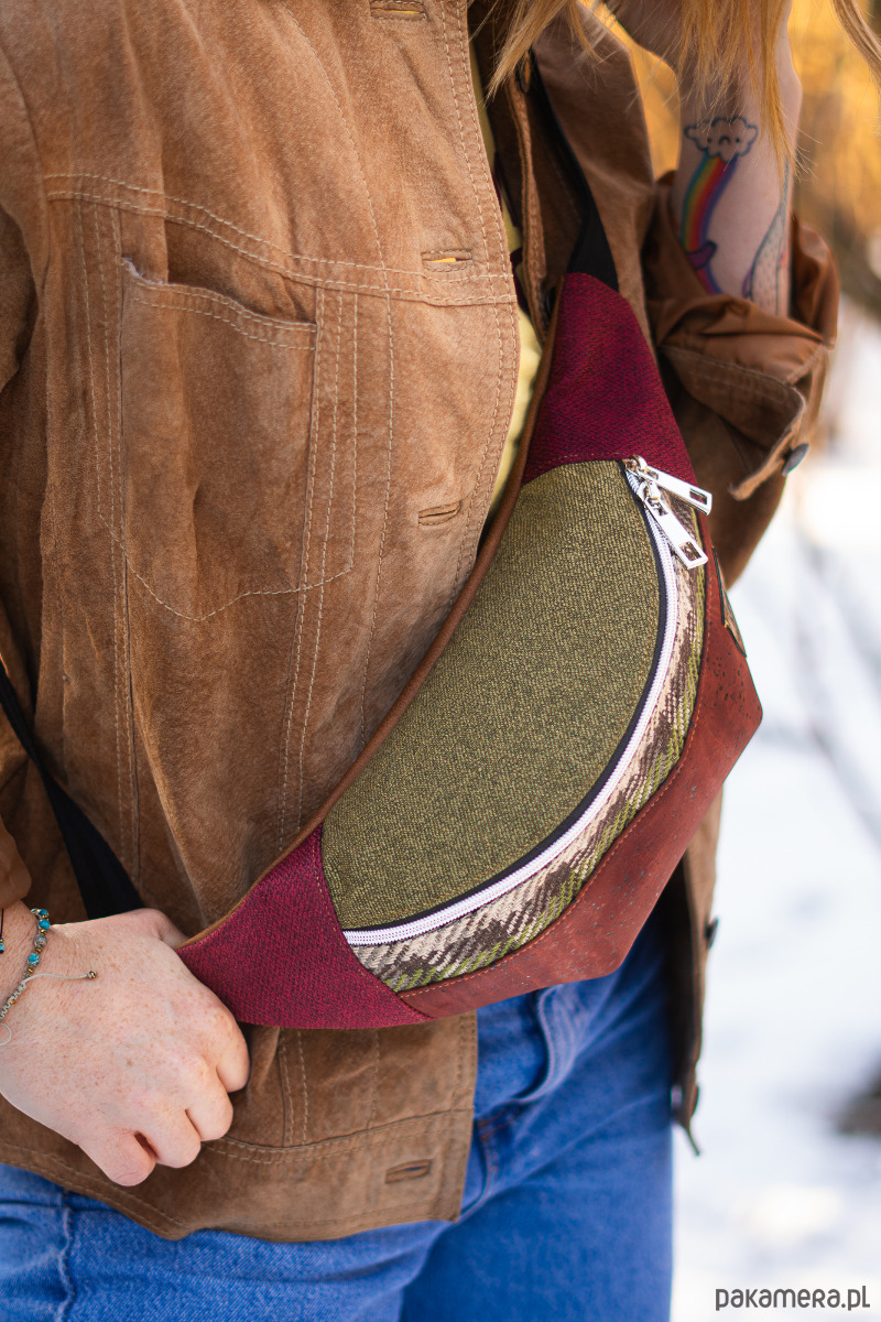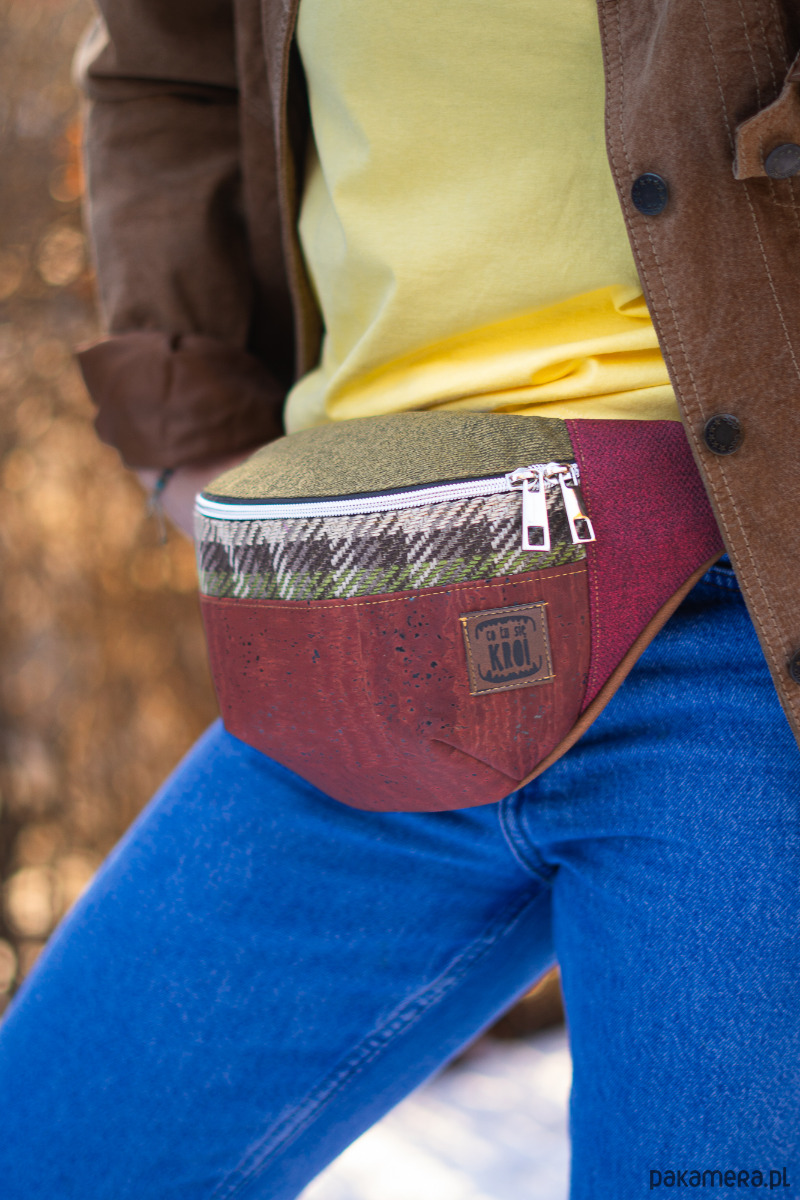 MATERIAŁ: kolorowa tkanina korkowa, tkaniny tapicerskie, wersja z bawełnianą podszewką 125 g/m2, pas samochodowy 25 mm.