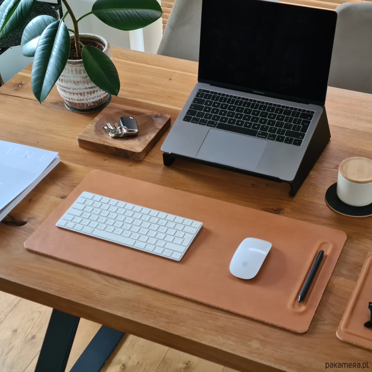 Idealnie nadaje się do mniejszych przestrzeni roboczych, w których przestrzeń jest ograniczona, podstawowa podkładka pod laptopa ma odpowiednią powierzchnię dla niezbędnych rzeczy, takich jak laptop lub klawiatura i gładzik + przybory do pisania.