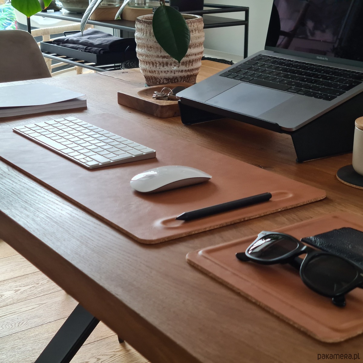 Zastosowana skóra Nappa to połączenie bardzo miękkiej i lekkiej tekstury, dzięki czemu jest wygodna w pracy. Dodatek podkładu z naturalnego korka pomaga utrzymać matę na biurku na miejscu i chronić obszar roboczy.