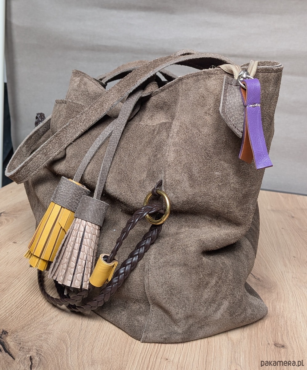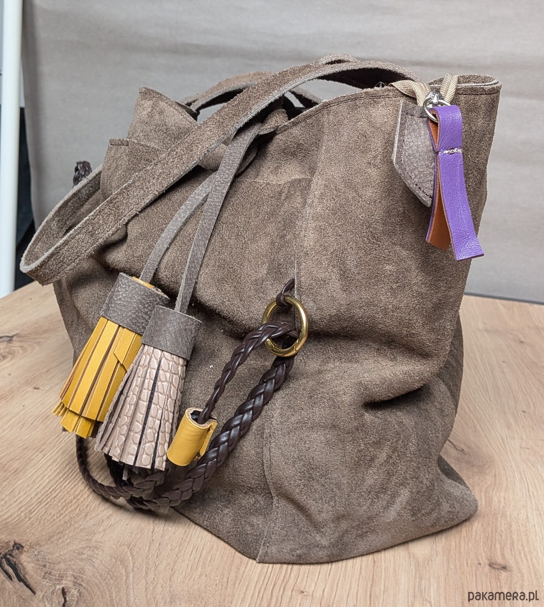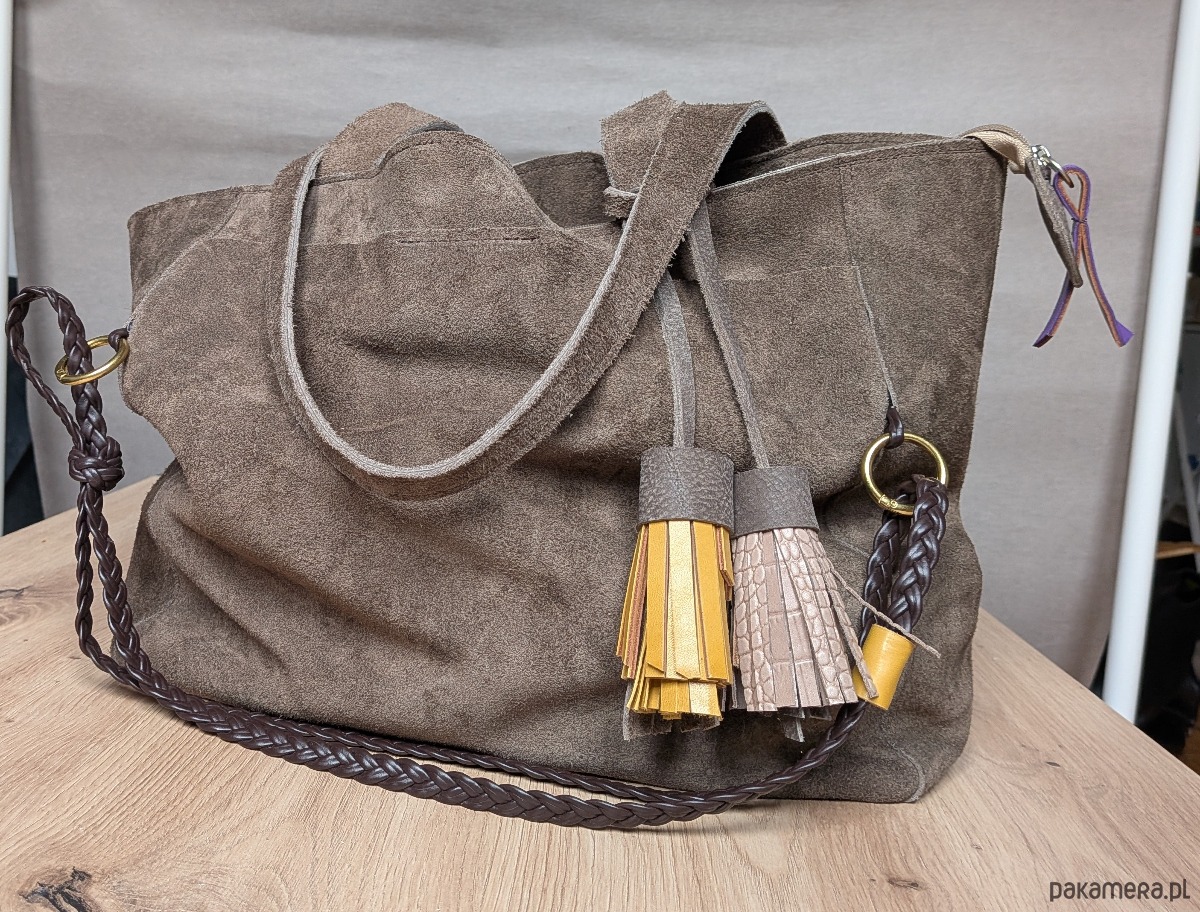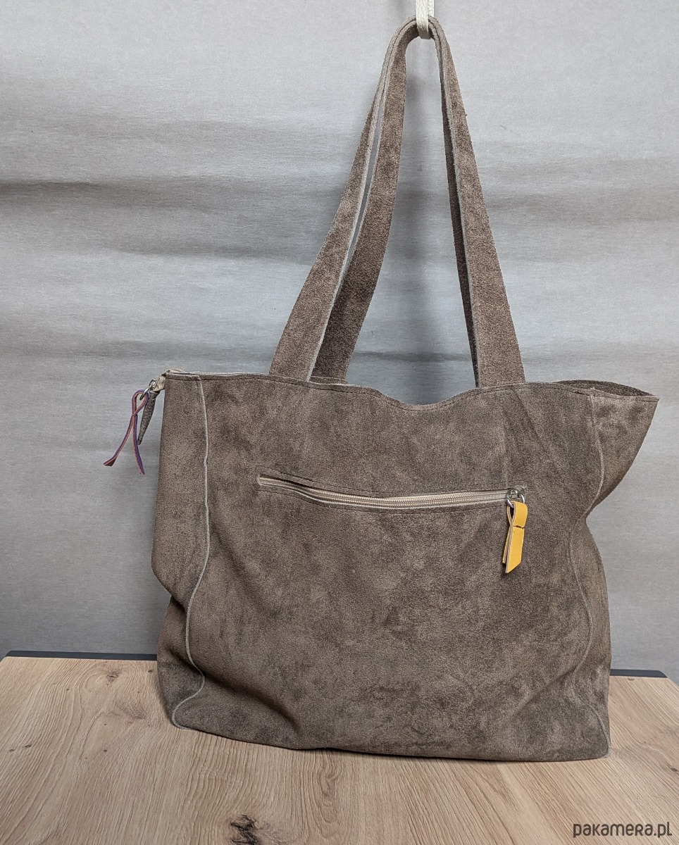 Torba z grubszej skóry, ładnie układa się podczas noszenia.