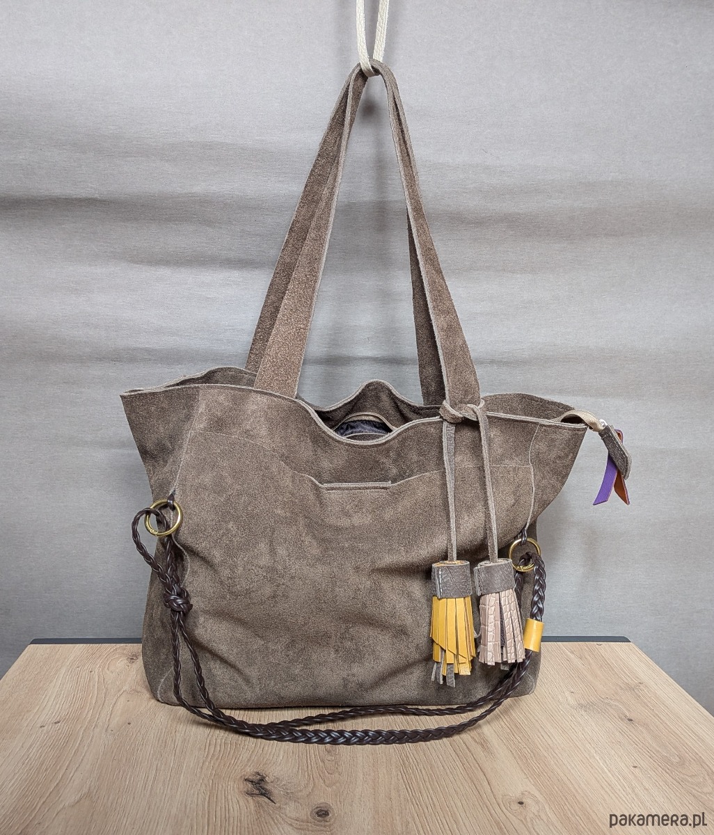 Duża, uszyta ze skóry naturalnej, w kolorze brązowym , odcień tabaczkowy. Zamszowa. .Z przodu duża kieszeń zapinana na magnes. . Z tyłu zewnętrzna kieszeń na zamek.