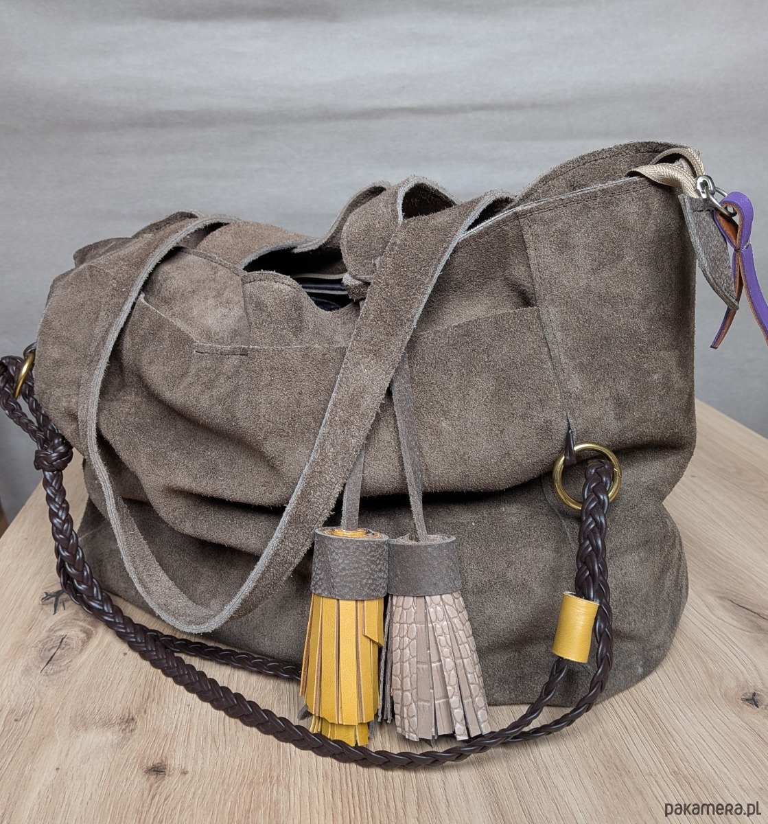 Ozdobą są podwójne frędzle i pleciony czekoladowy pasek. pasek i frędzle można odczepić.