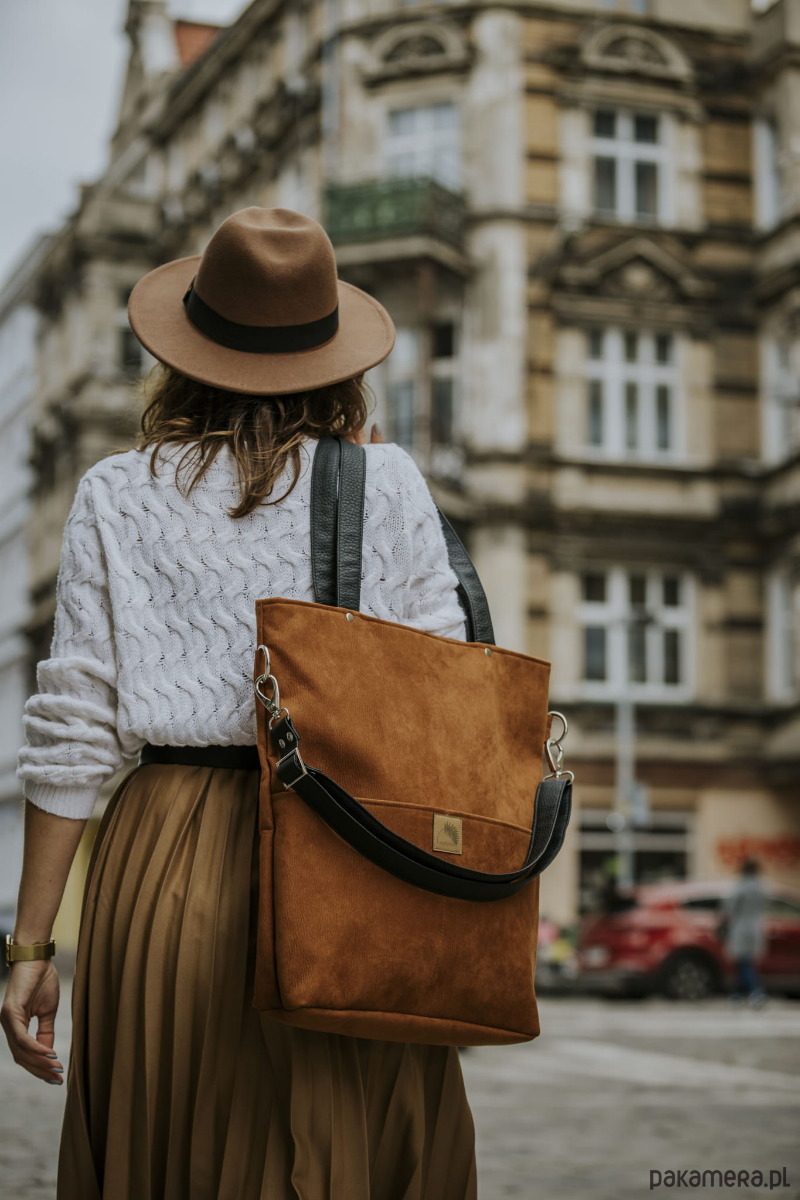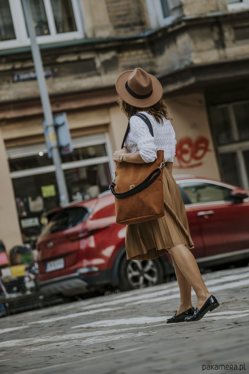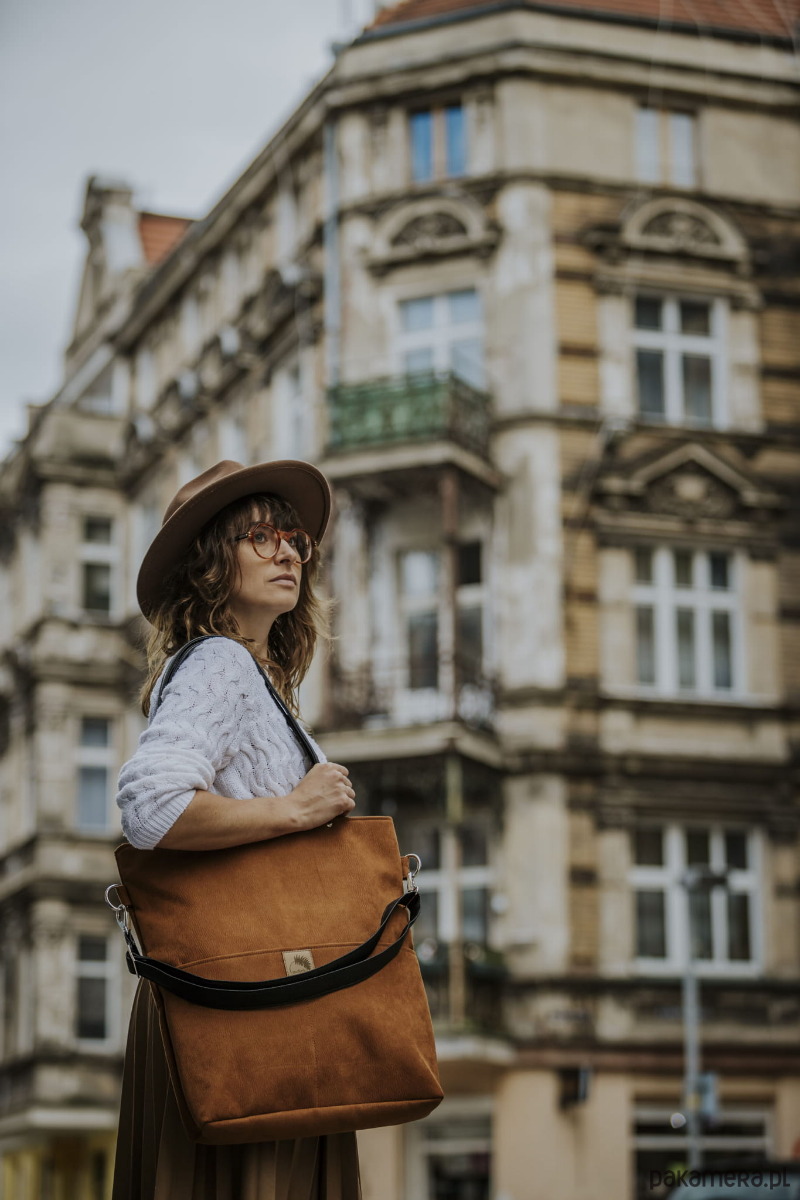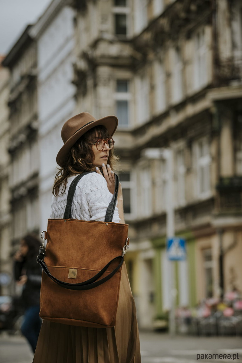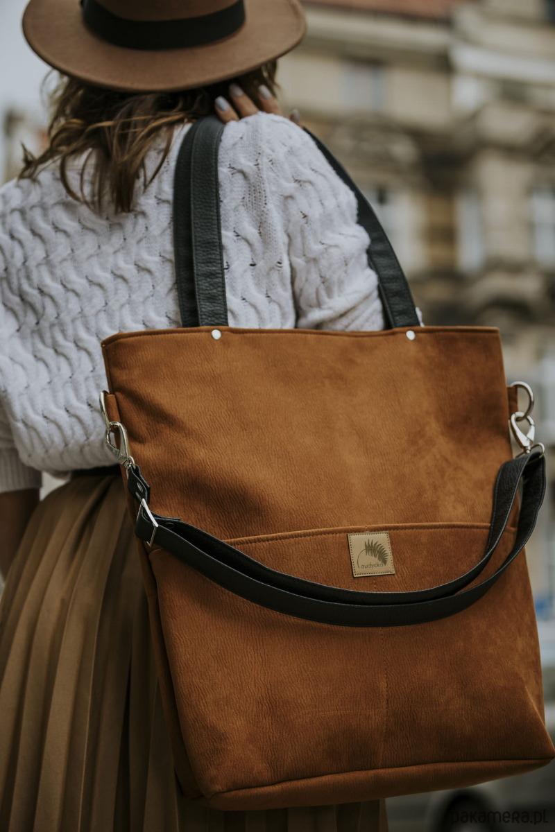 Duża zamszowa torba (sztywny, gruby, wodoodporny nubuk ekologiczny ) w kolorze ciemny beż/kawa z mlekiem do noszenia na ramieniu i na skos na długim regulowanym, dopinanym pasku.