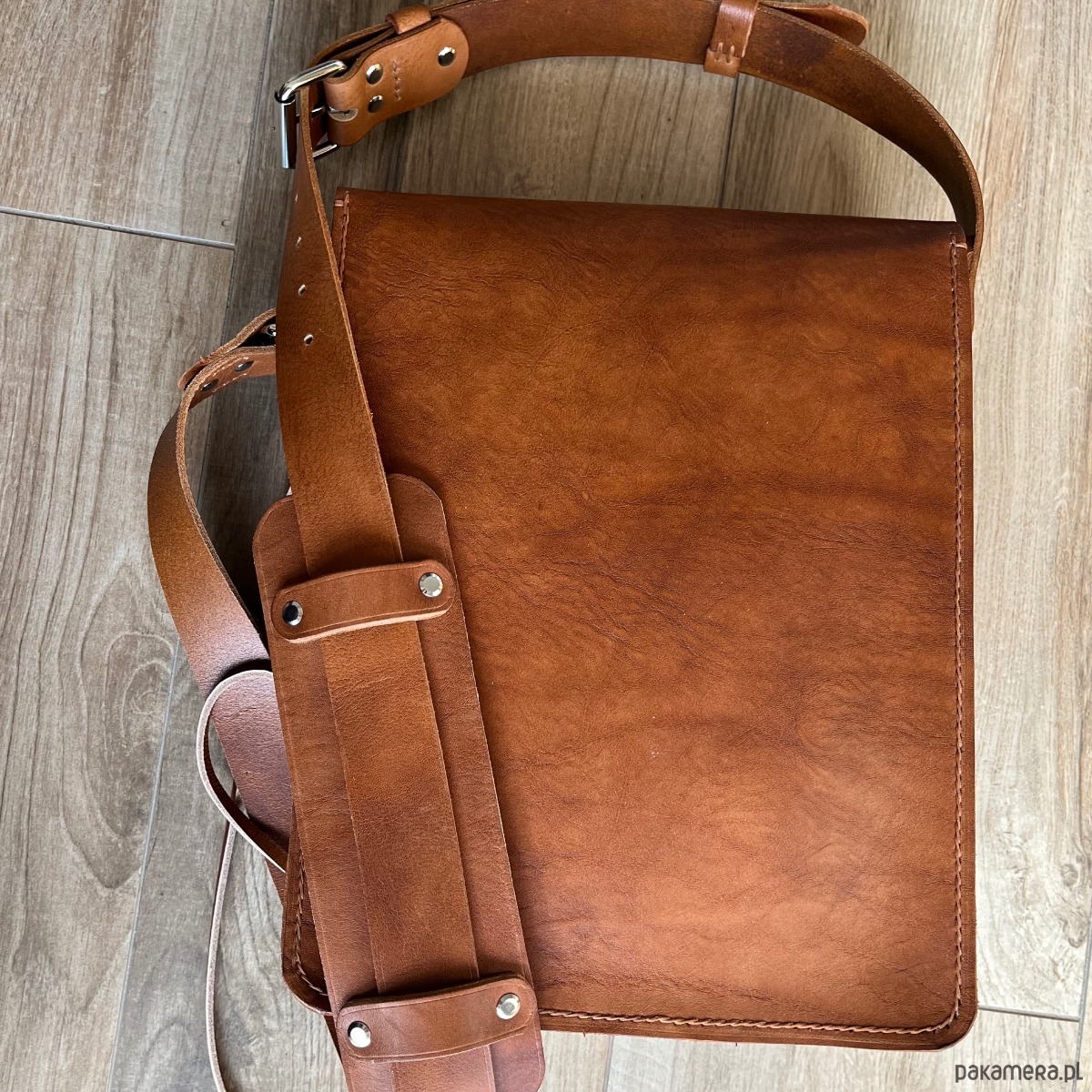 Brązowa torba ze skóry A4 ręcznie uszyta.
