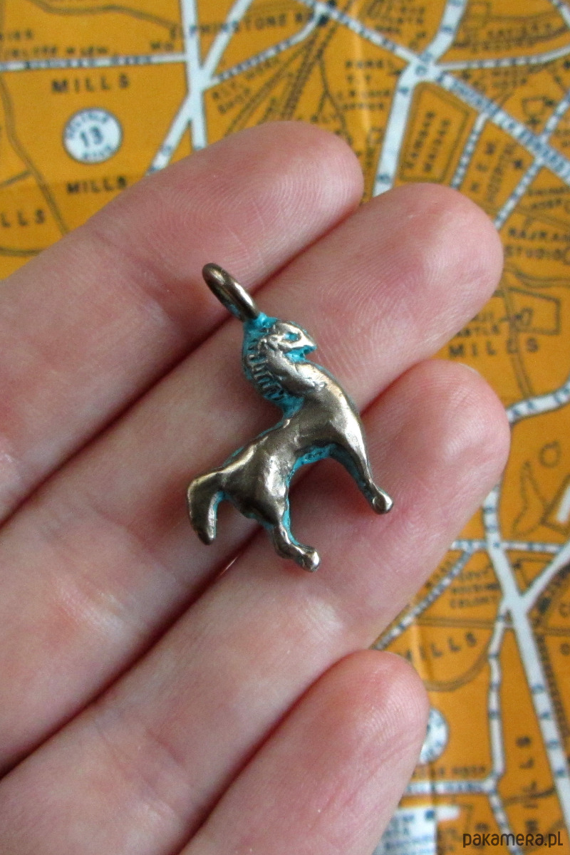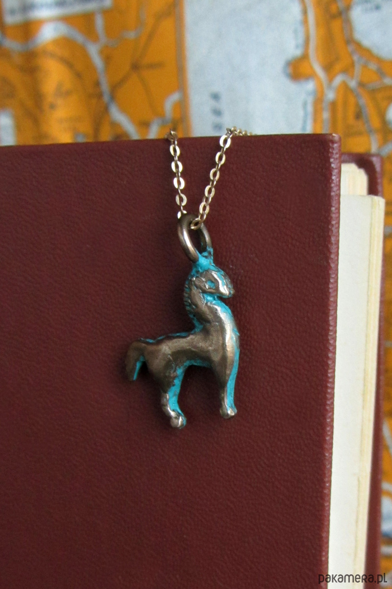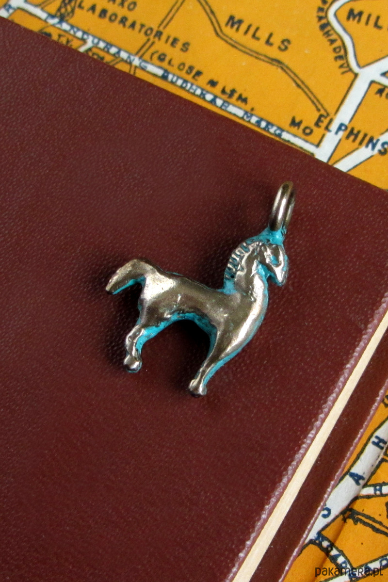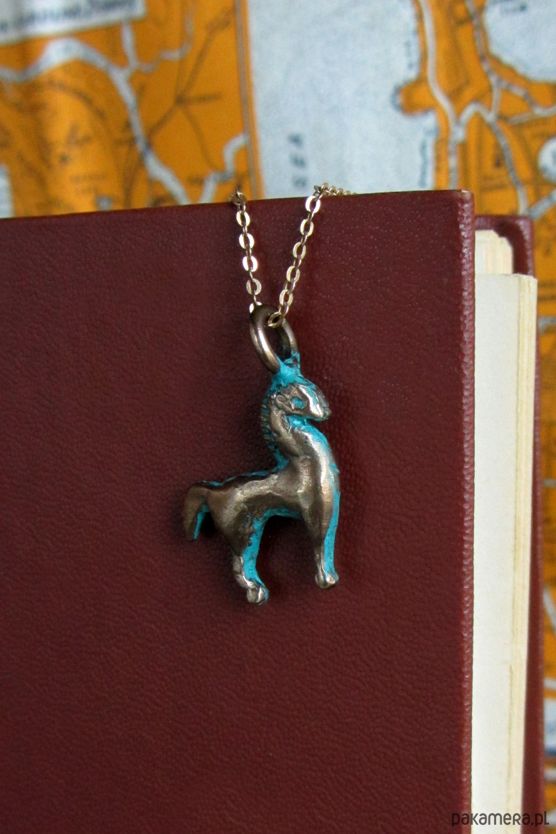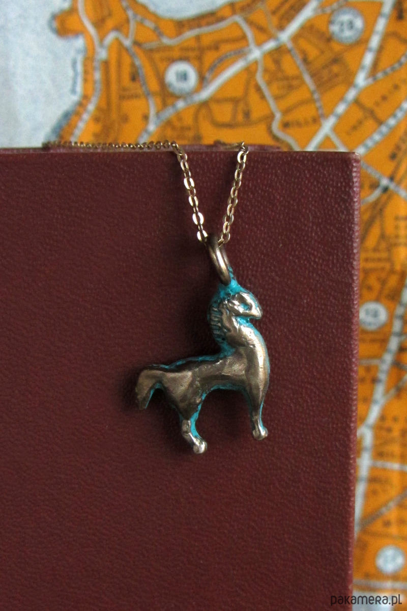 Ręcznie rzeźbiona zawieszka przedstawiająca konika inspirowana sztuką epoki brązu. Wykonana od podstaw metodą wosku traconego z brązu w krakowskiej pracowni.