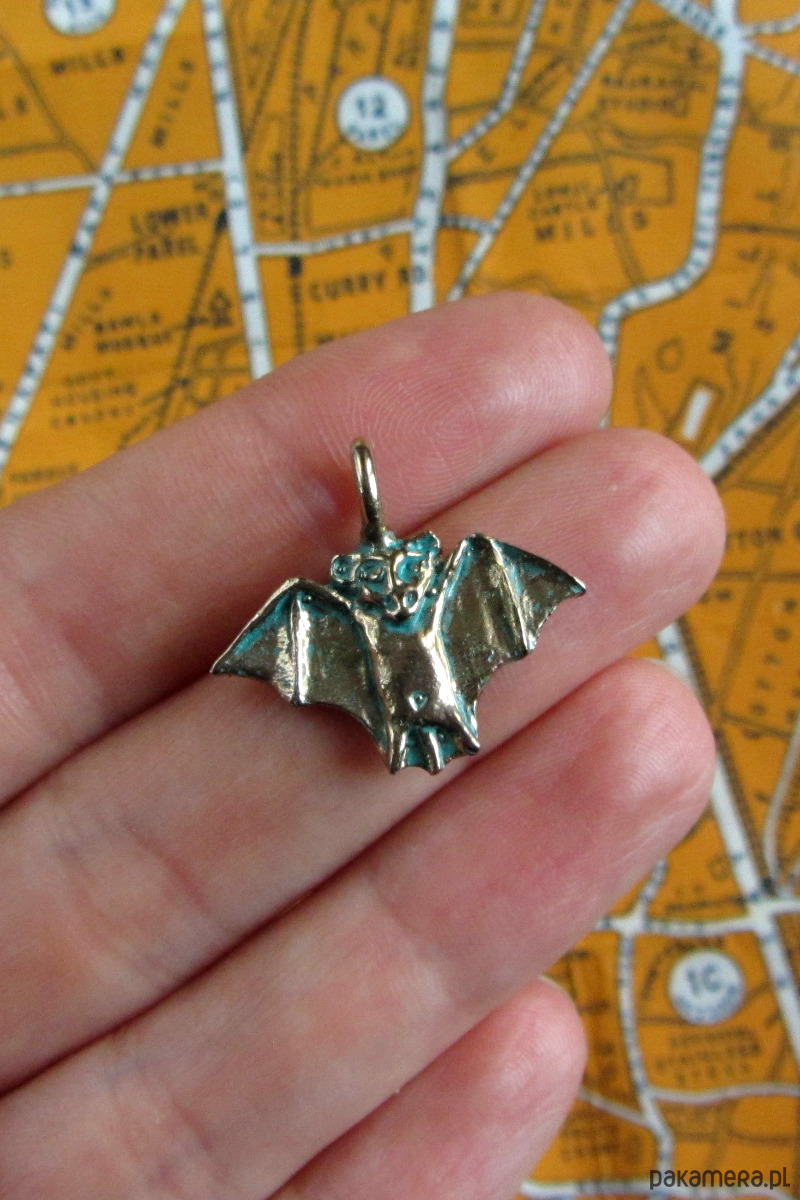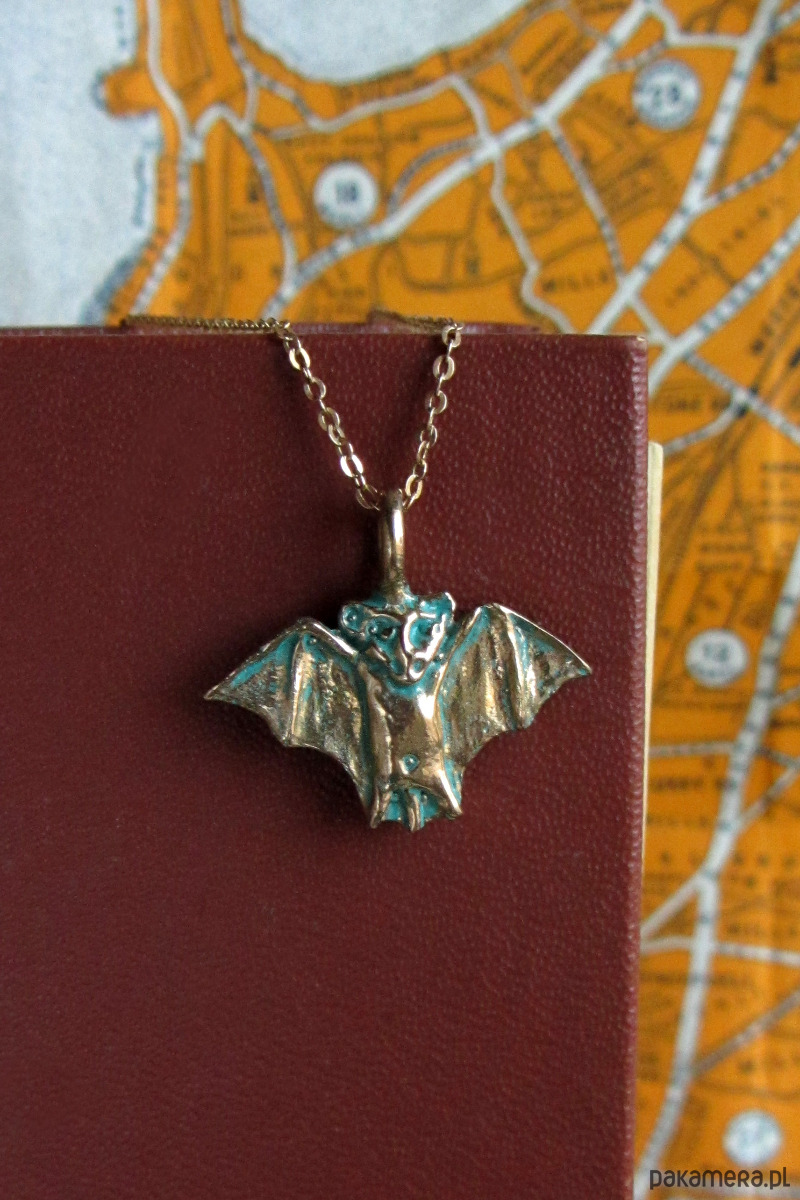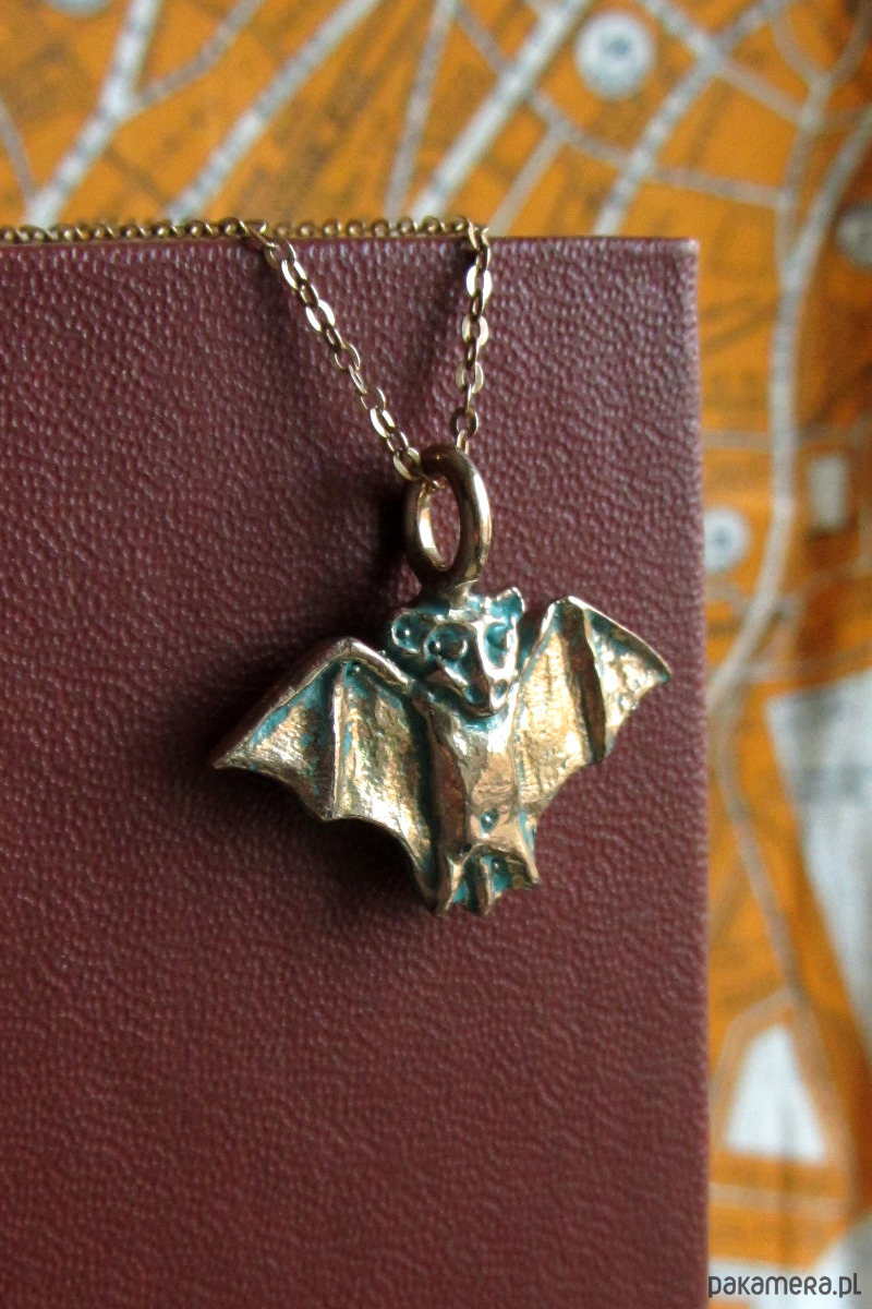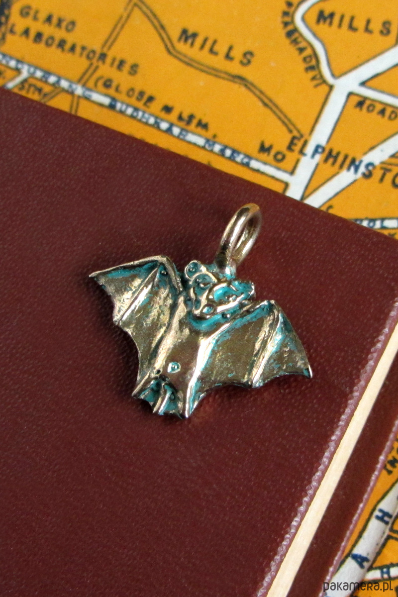 Ręcznie rzeźbiona zawieszka przedstawiająca nietoperza inspirowana średniowiecznymi manuskryptami. Zawieszka wykonana od podstaw metodą wosku traconego ze srebra w krakowskiej pracowni oraz patynowana.