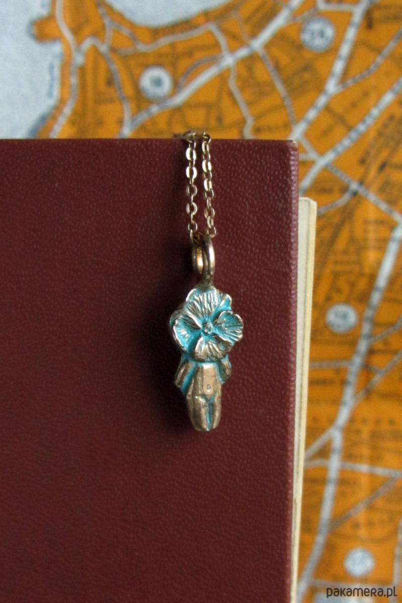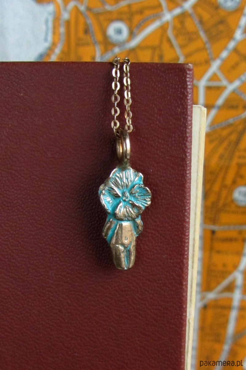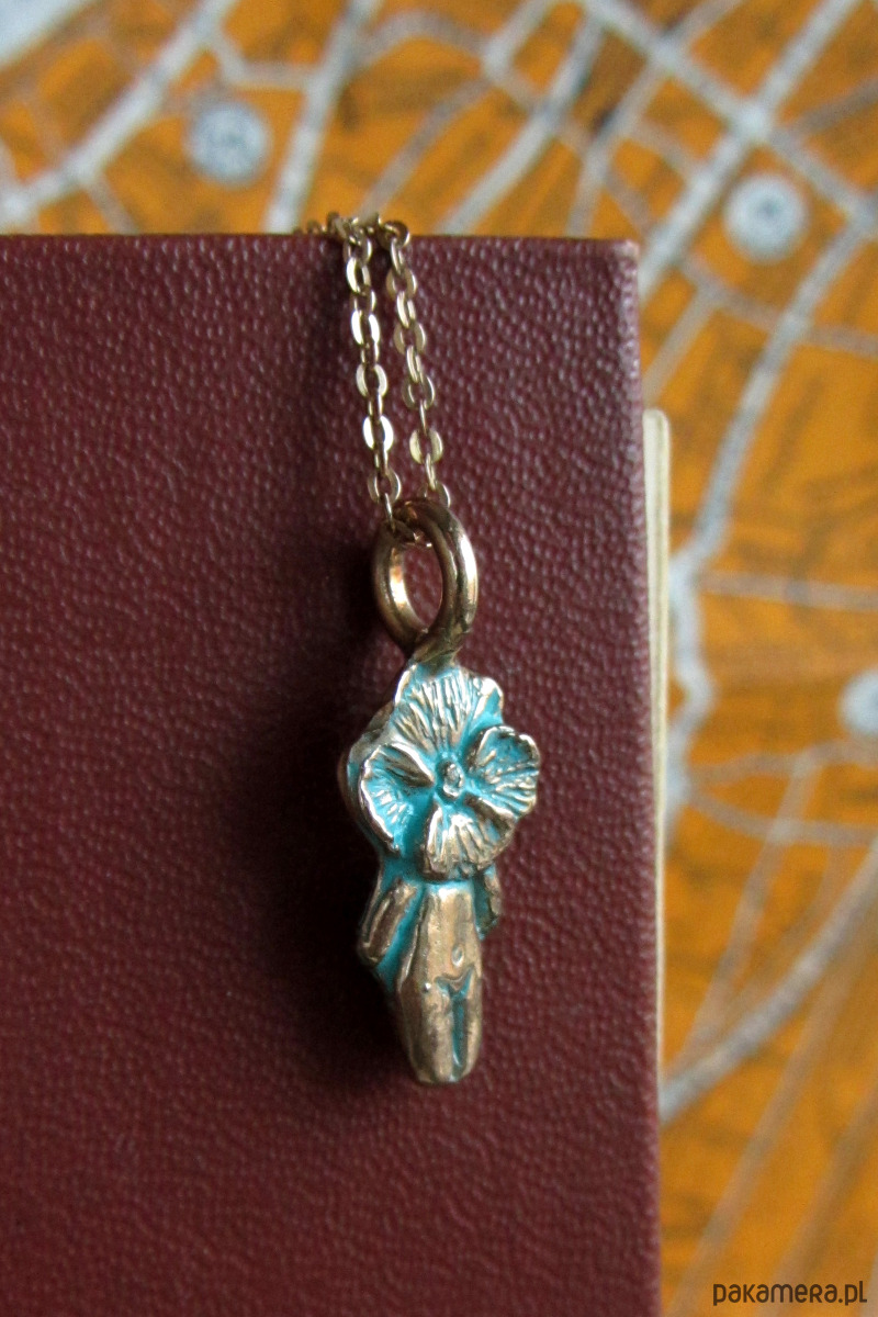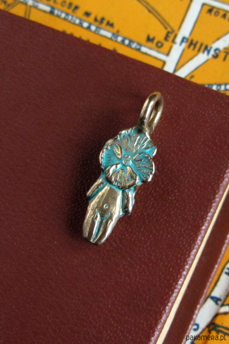 Ręcznie rzeźbiona zawieszka z patynowanego brązu.