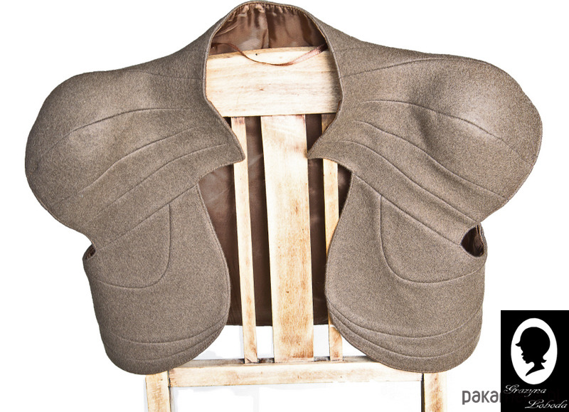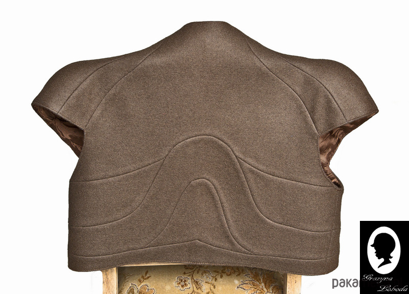Brązowe bolerko na podszewce, z krótkim rękawem raglanowym i z niską stójką. Z przodu rozcięte – bez zapięcia; sięgające powyżej pasa. Bolerko uzyskuje swój unikalny kształt dzięki cięciom na wiele elementów. Cięcia pełnią również funkcję ozdobną.