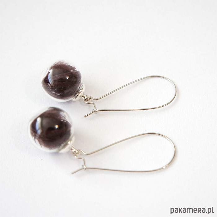Delikatne piórka w odcieniu ciemnego brązu umieszczone w szklanych bańkach o średnicy ok. 1,5 cm.