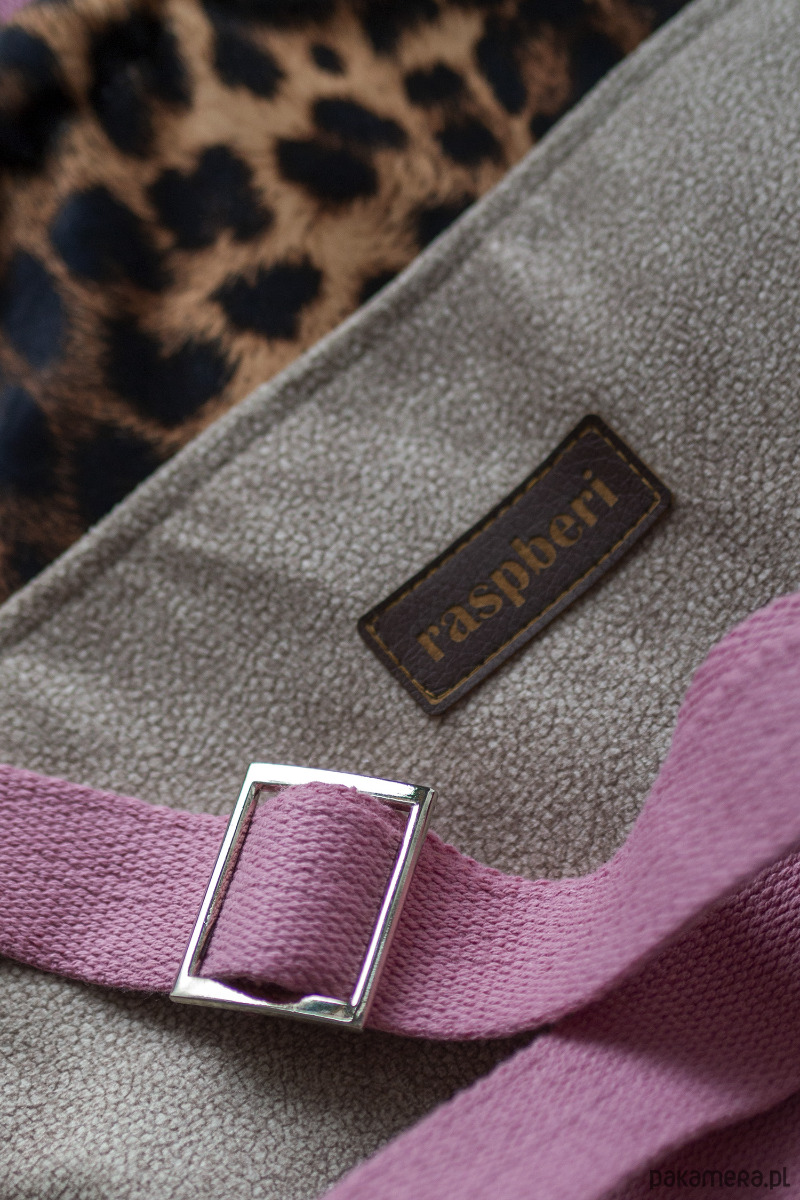 Wykonany z weluru w panterkę. Z przodu oraz z na tyle torebki kieszenie (np. na telefon czy chusteczki) z beżowego weluru.