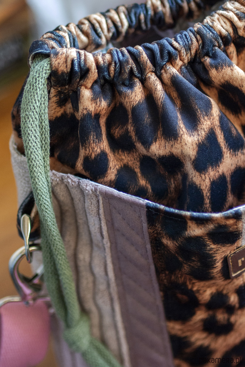 Wykonana z weluru w panterkę. Z przodu oraz z na tyle torebki kieszenie (np. na telefon czy chusteczki) z pudroworóżowego grubego sztruksu, pikowanego weluru, weluru w kolorze beżowym oraz weluru w panterkę. W środku kieszonka zapinana na suwak.