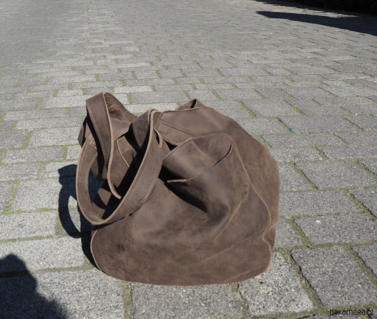 Miękki duży skórzany worek. Kolor brąz kawowy, skóra nubukowa. Miękka, mięsista, i aksamitna w dotyku, miejscami ma ciemniejsze kreski, naturalne na skórze.