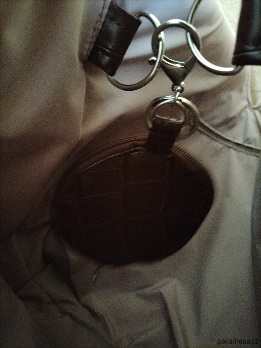 Duża torba na ramię z możliwością modyfikacji formy poprzez przepięcie breloka.