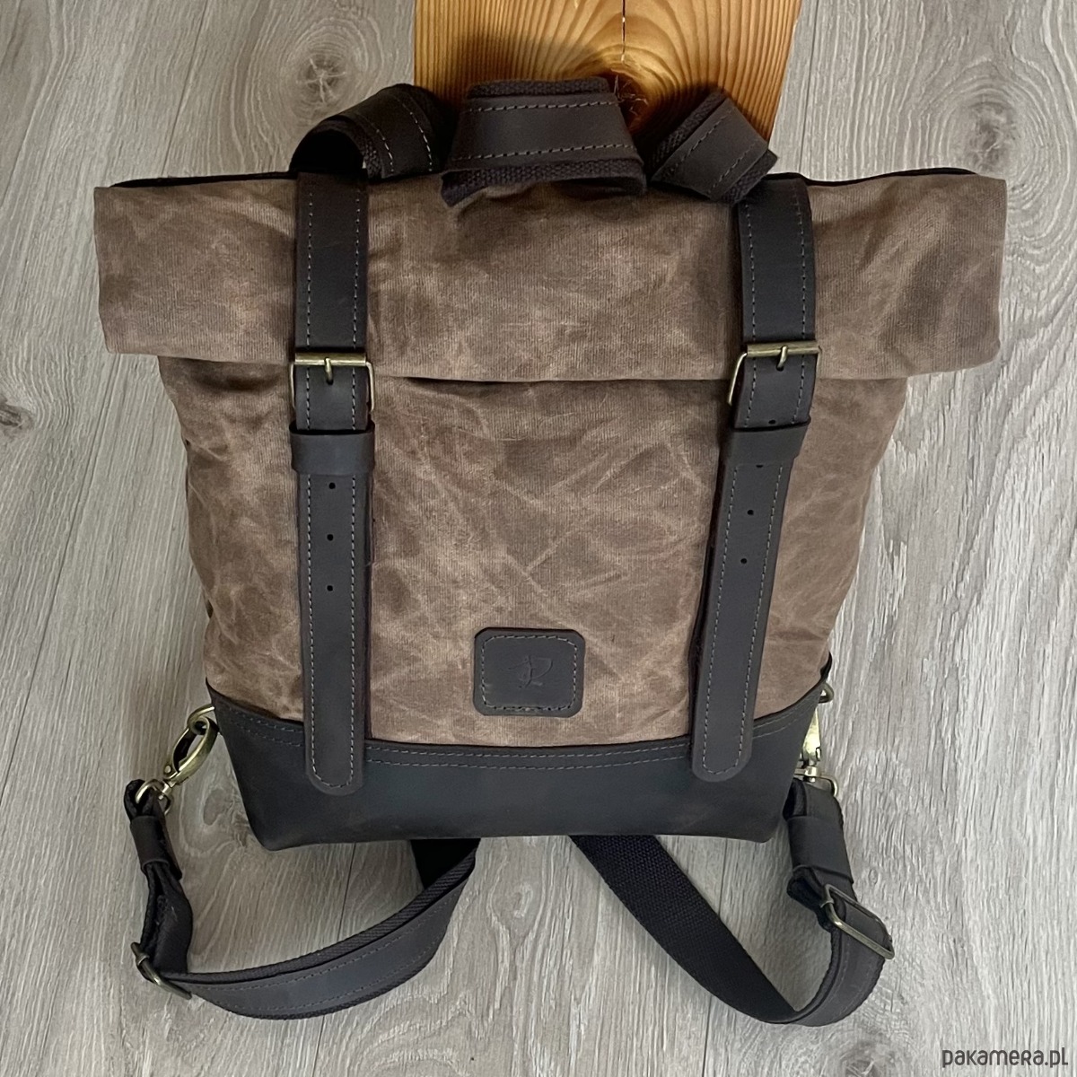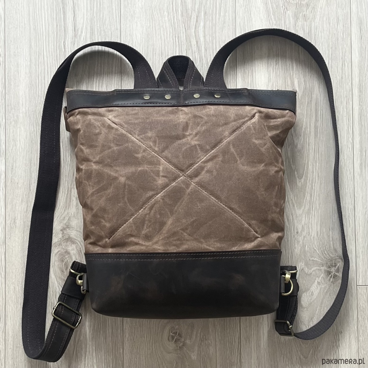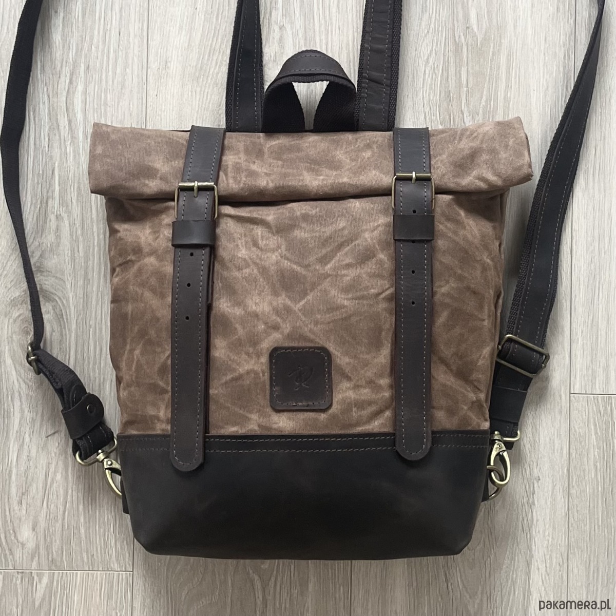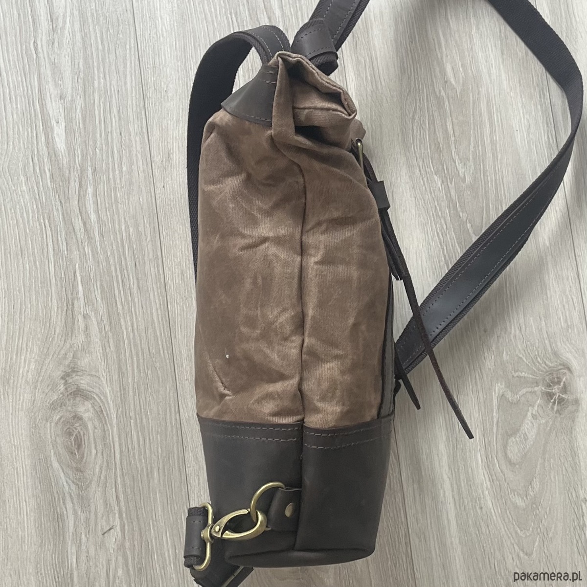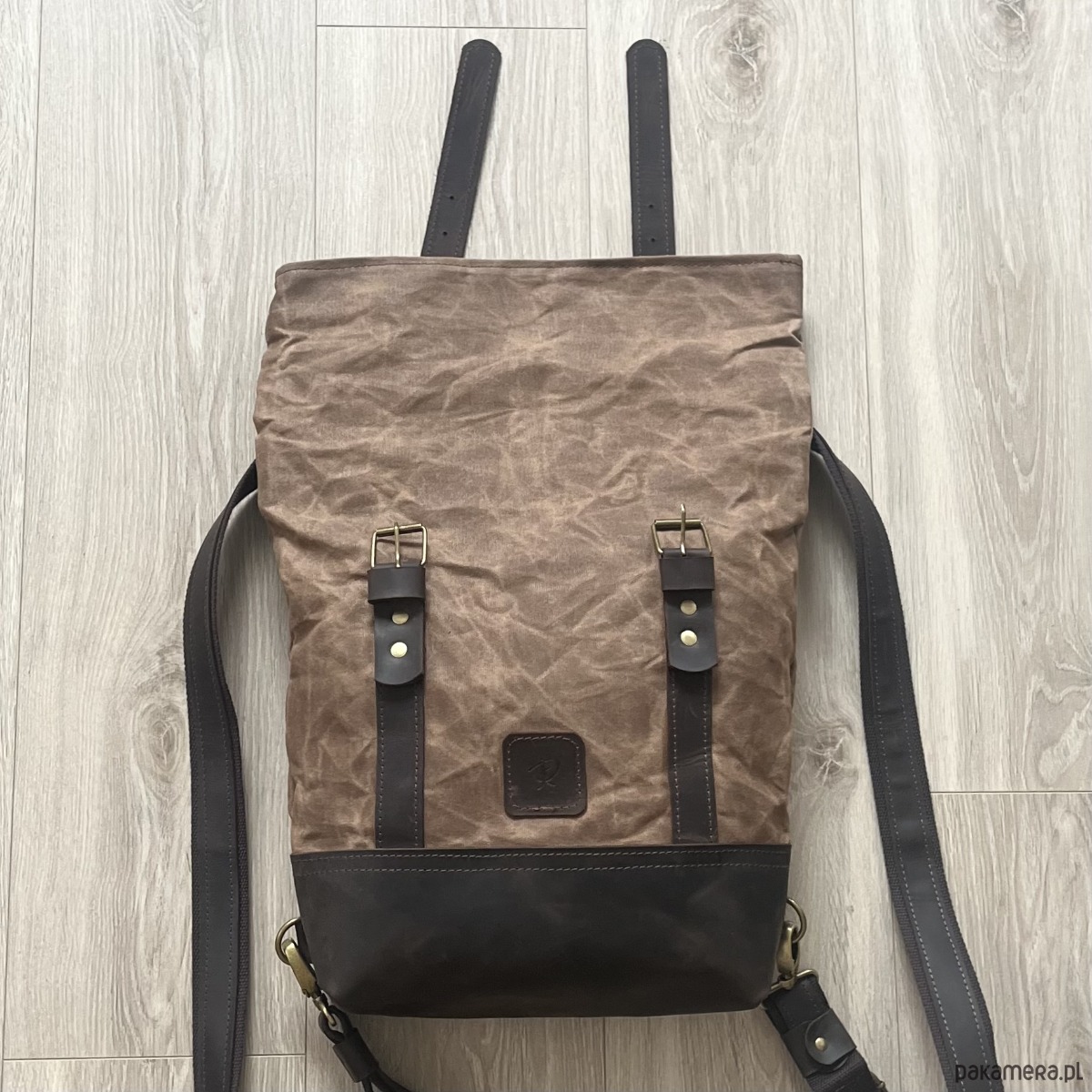 Brązowy plecak ze skóry i bawełny woskowanej zapinany na dwie klamry.