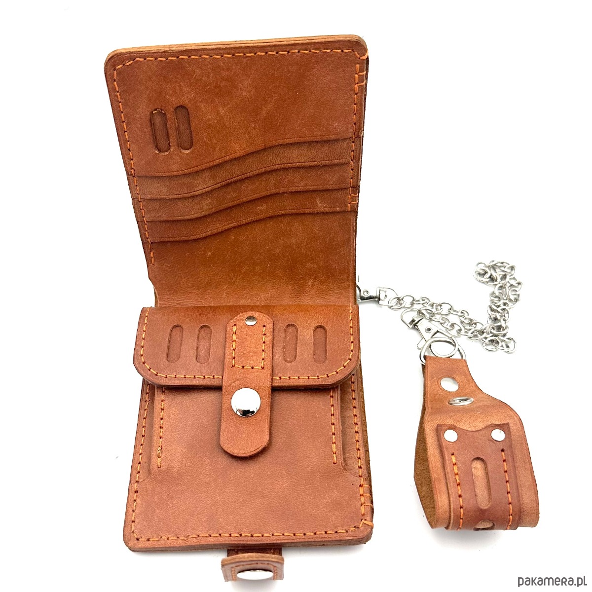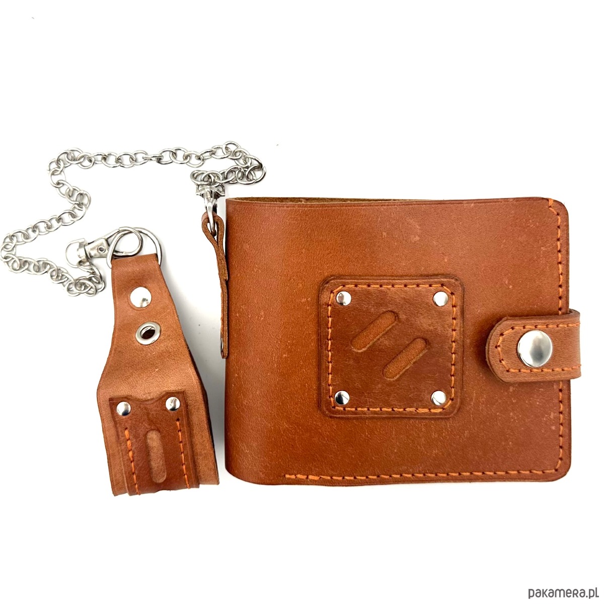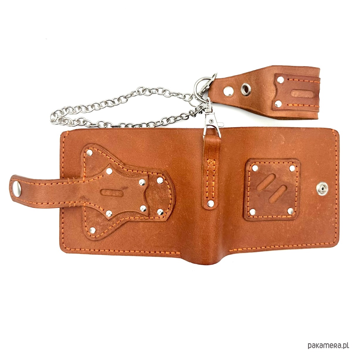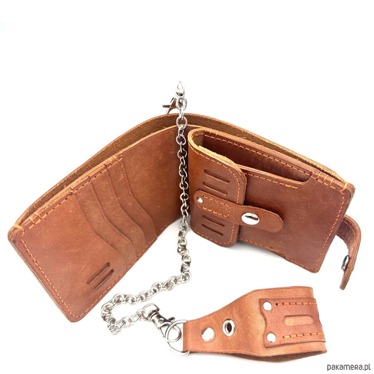 Brązowy portfel skórzany na bilon ręcznie uszyty z łańcuszkiem.