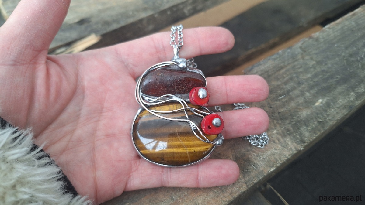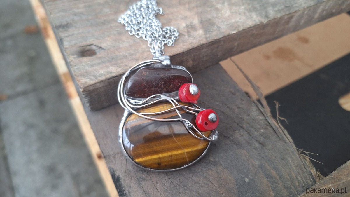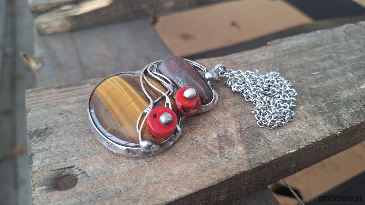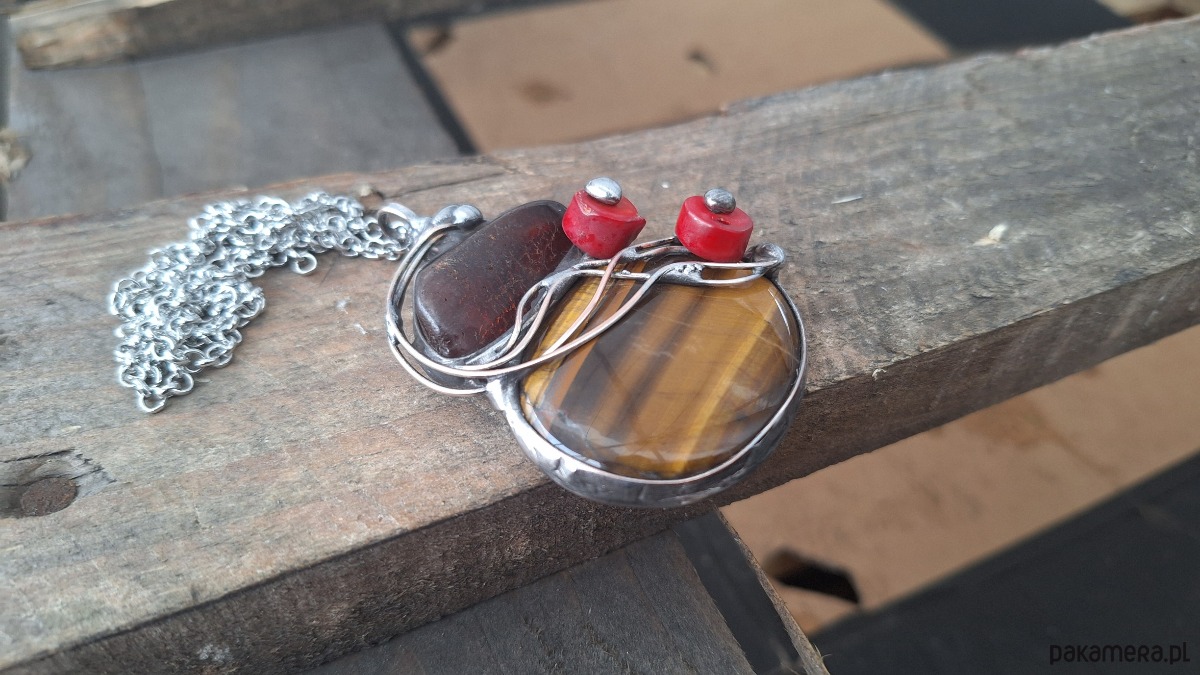 Wisiorek wykonany z miedzi, cyny, koralowców, bursztynu i tygrysiego oka. Wymiary ok. 5.5 na 4.5 cm. Zawieszony na łańcuszku o długości ok. 50 cm.