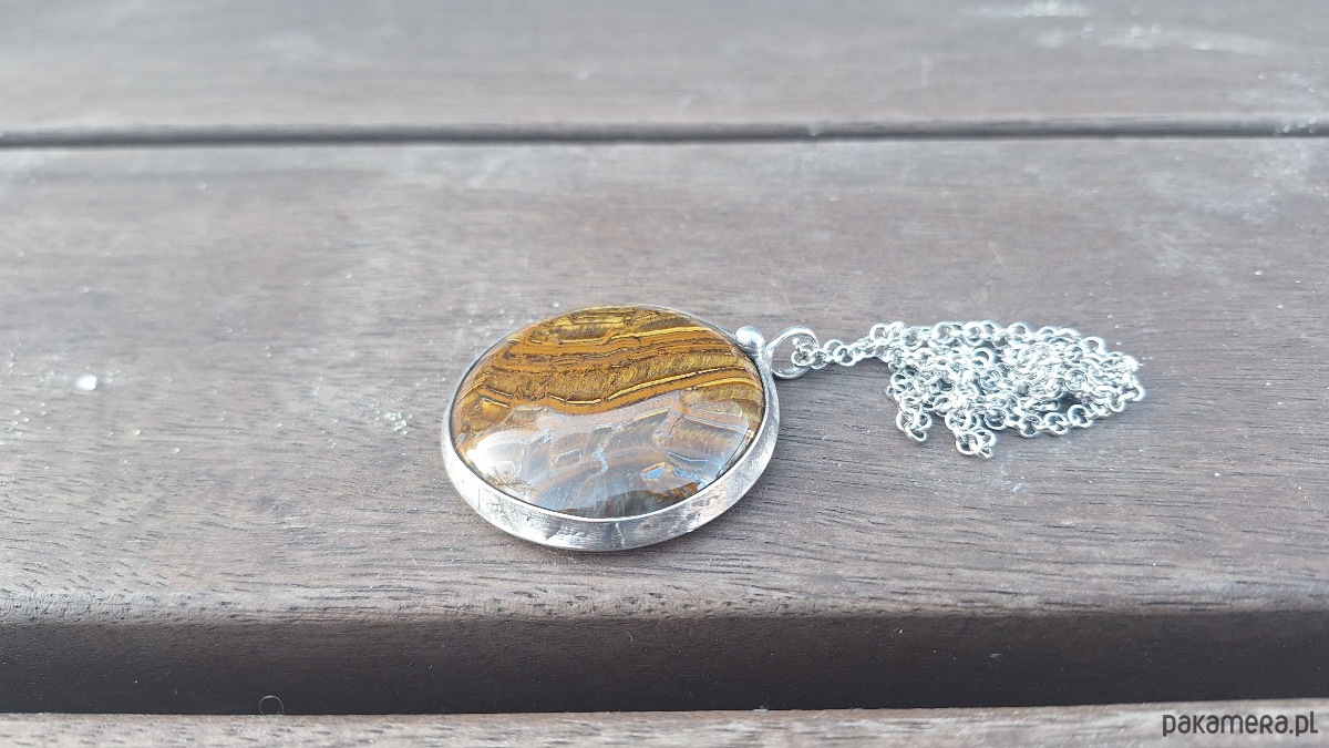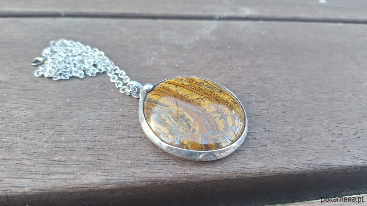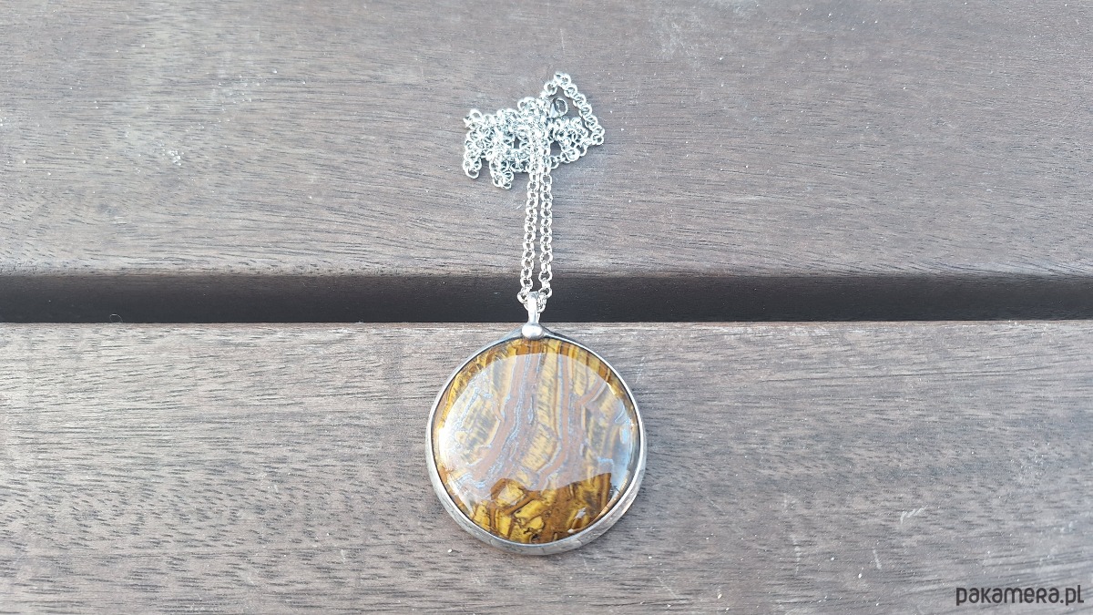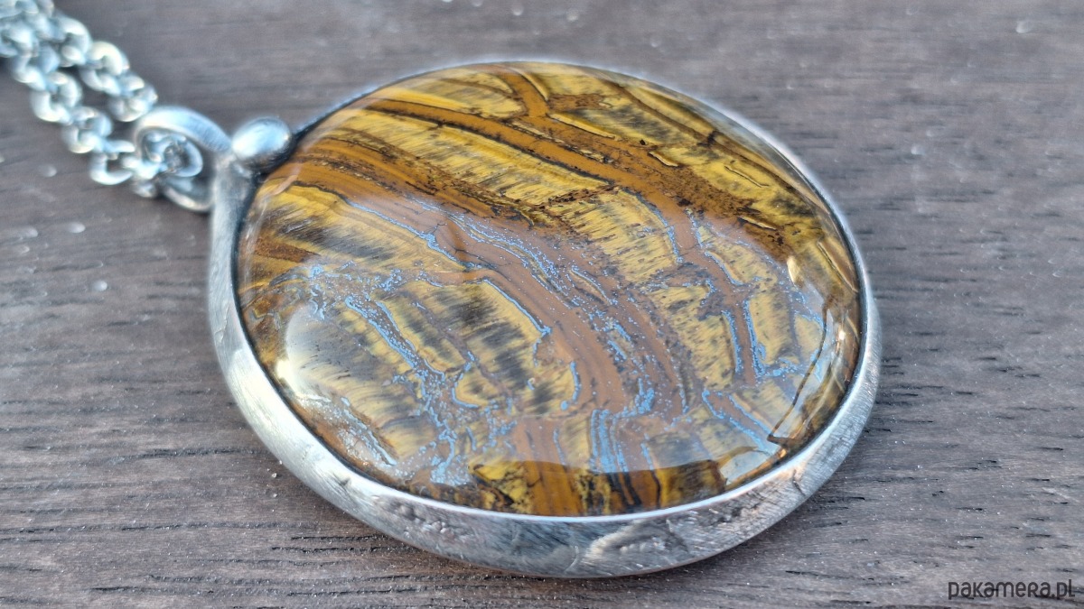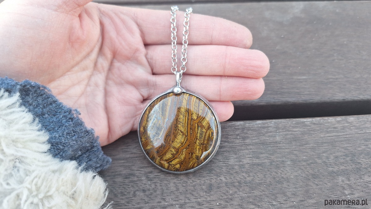 Wisiorek wykonany z miedzi, cyny i tygrysiego oka. Wymiary ok. 5 na 5 cm. Zawieszony na łańcuszku o długości ok. 50 cm.