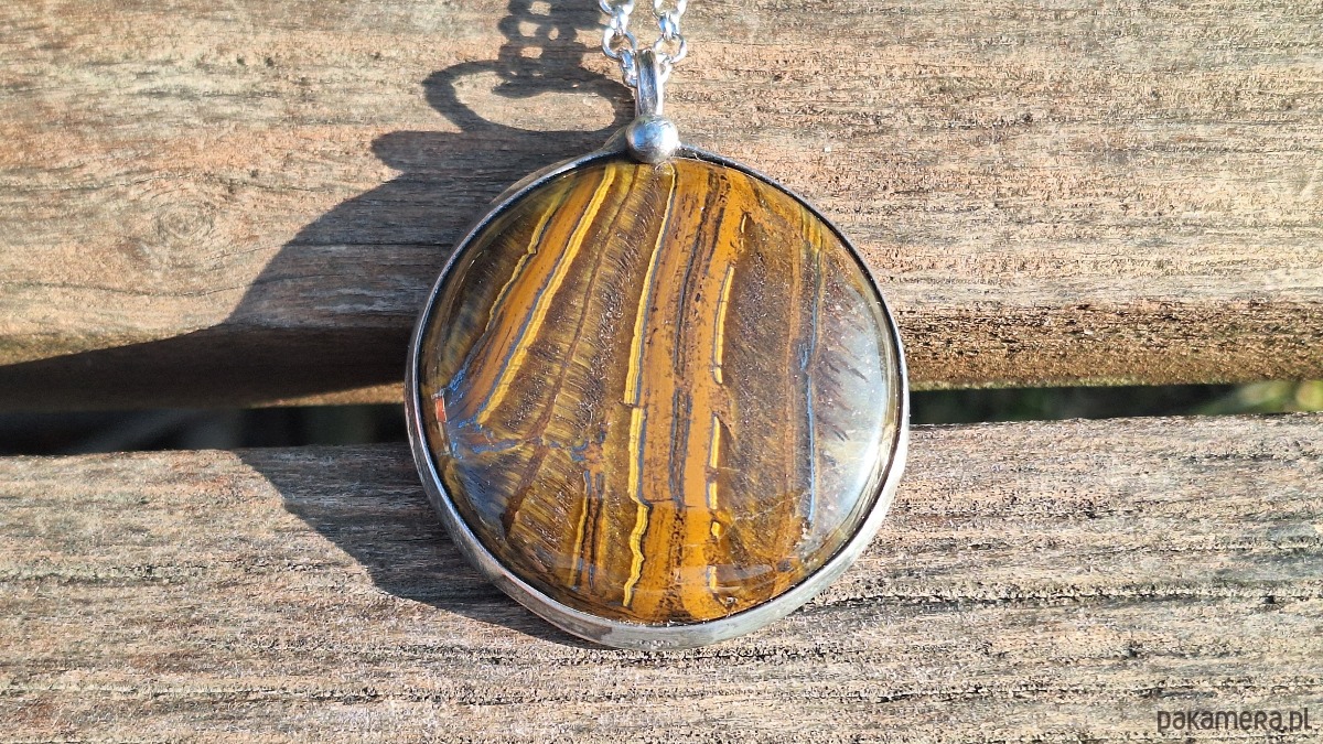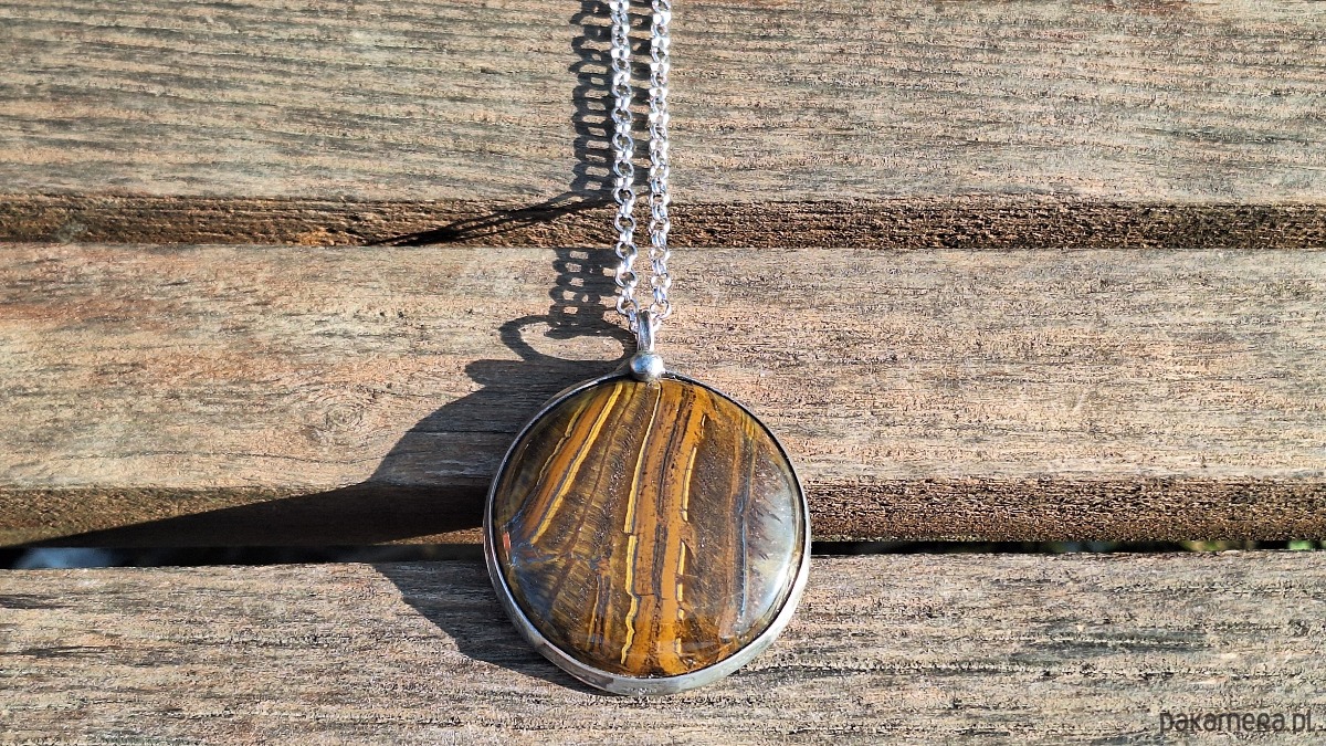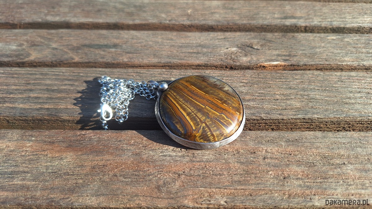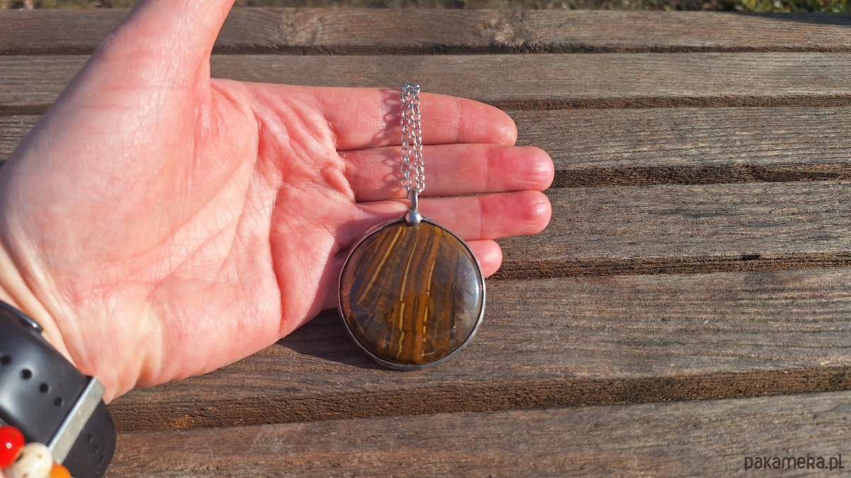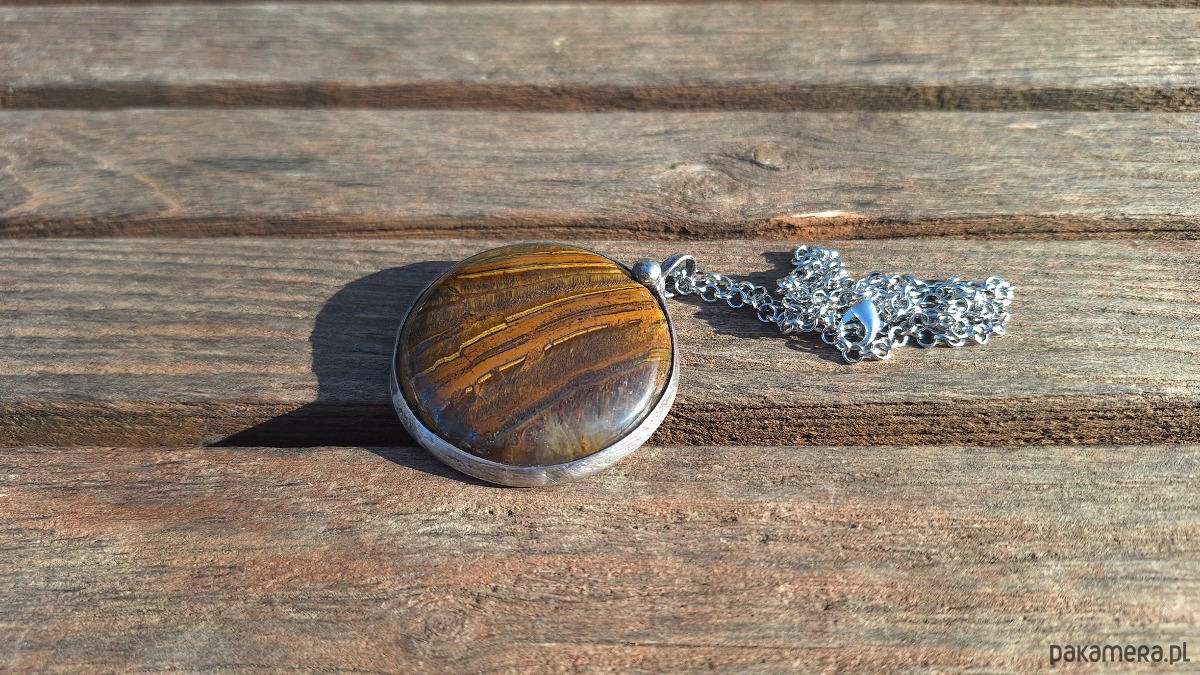 Wisiorek wykonany z miedzi, cyny i tygrysiego oka. Wymiary ok. 4.5 na 4.5 cm. Zawieszony na łańcuszku o długości ok. 50 cm.