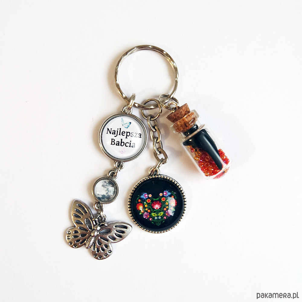 Niezwykły brelok z naszymi autorskimi grafikami, szklaną fiolką oraz zawieszką.