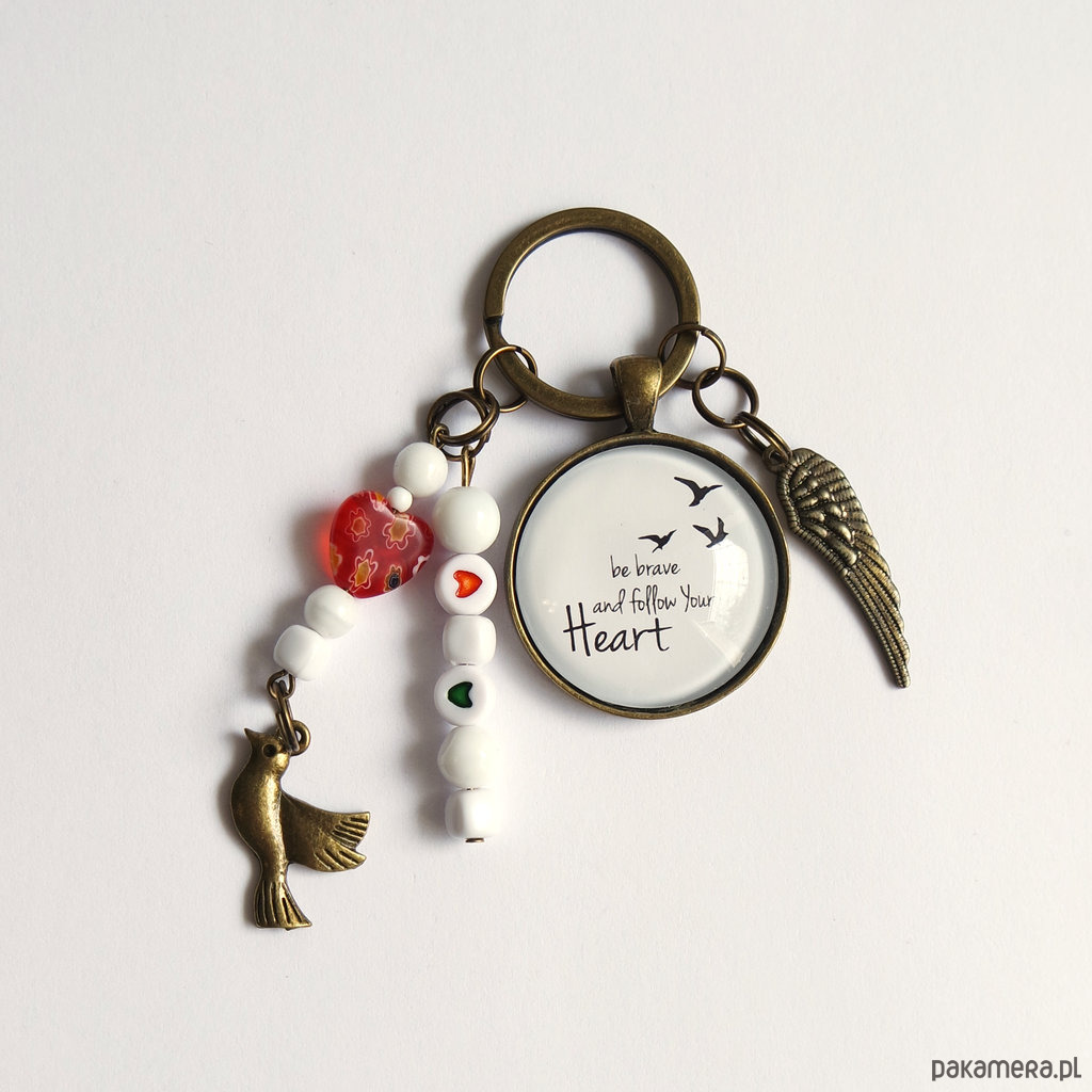 Niezwykły brelok z grafiką z napisem, kompozycją z koralików oraz zawieszkami.
