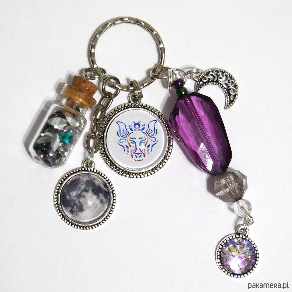 Niezwykły brelok z naszymi autorskimi grafikami, kompozycją z koralików, szklaną fiolką oraz zawieszkami.