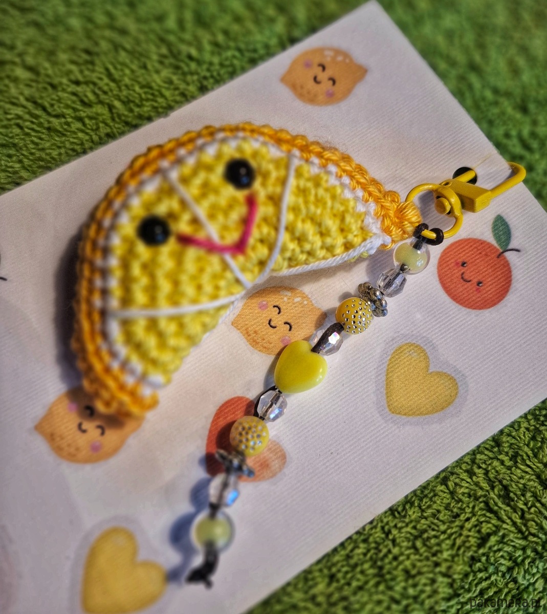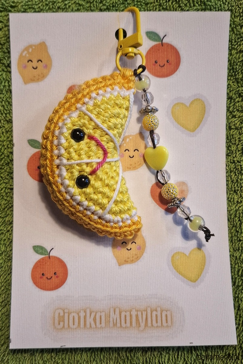 Ten wyjątkowy brelok został wykonany na szydełku z dbałością o każdy detal. Intensywny kolor, biały „miąższ”, błyszczące oczka i delikatny uśmiech tworzą niepowtarzalny, radosny charakter.