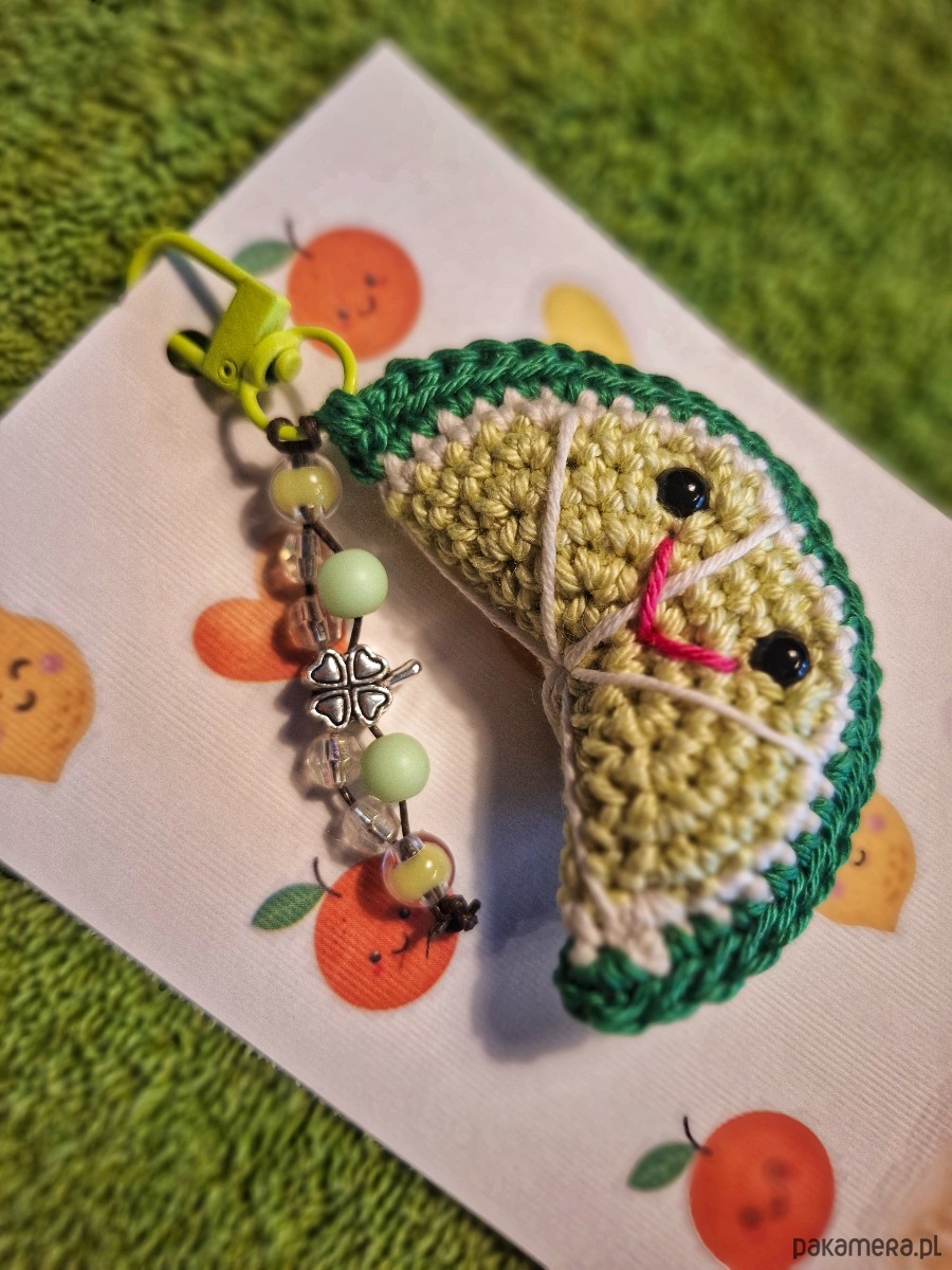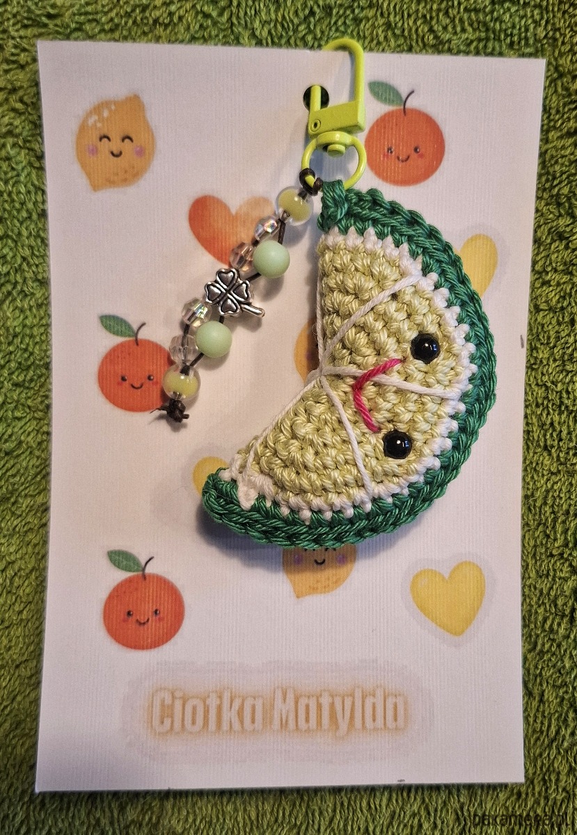 Ten wyjątkowy brelok został wykonany na szydełku z dbałością o każdy detal. Intensywny kolor, biały „miąższ”, błyszczące oczka i delikatny uśmiech tworzą niepowtarzalny, radosny charakter.