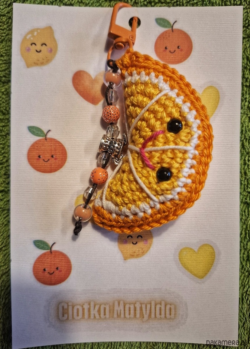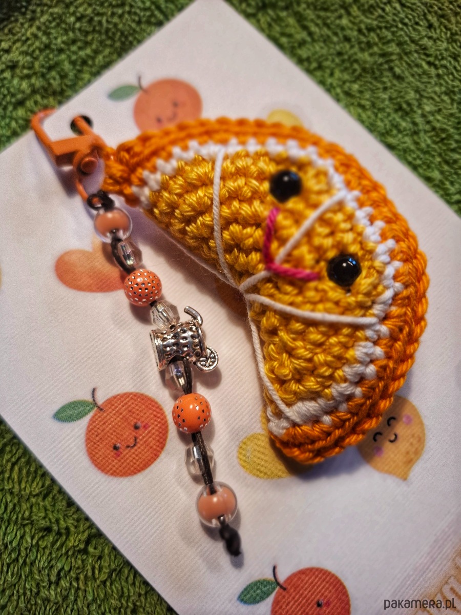 Ten wyjątkowy brelok został wykonany na szydełku z dbałością o każdy detal. Intensywny kolor, biały „miąższ”, błyszczące oczka i delikatny uśmiech tworzą niepowtarzalny, radosny charakter.