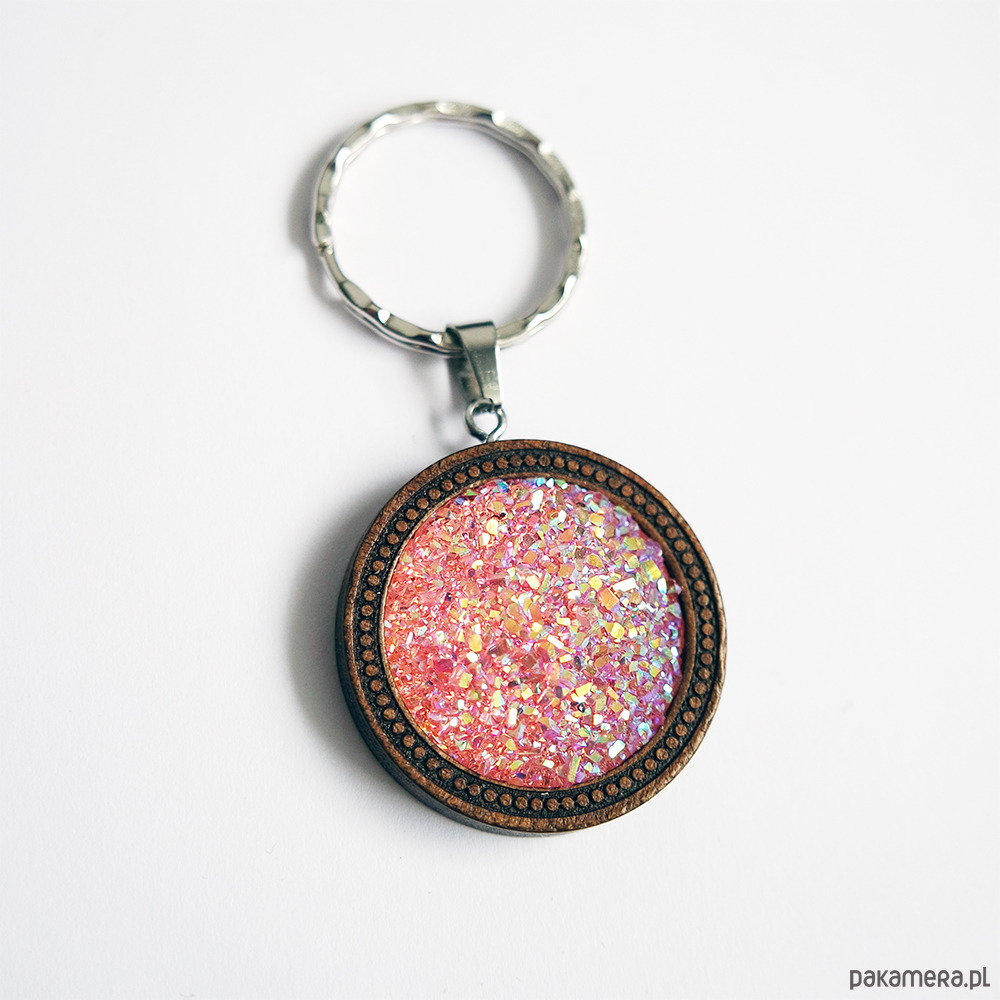 Oryginalny brelok w drewnianej oprawie z kaboszonem z żywicy - druzy, mieniący się w odcieniach różu i złota.