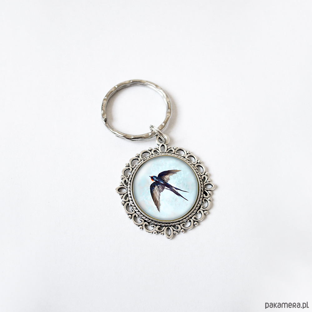 Grafika ukryta w pięknie zdobionym breloczku, pod osłoną przeźroczystego półokrągłego szkiełka.