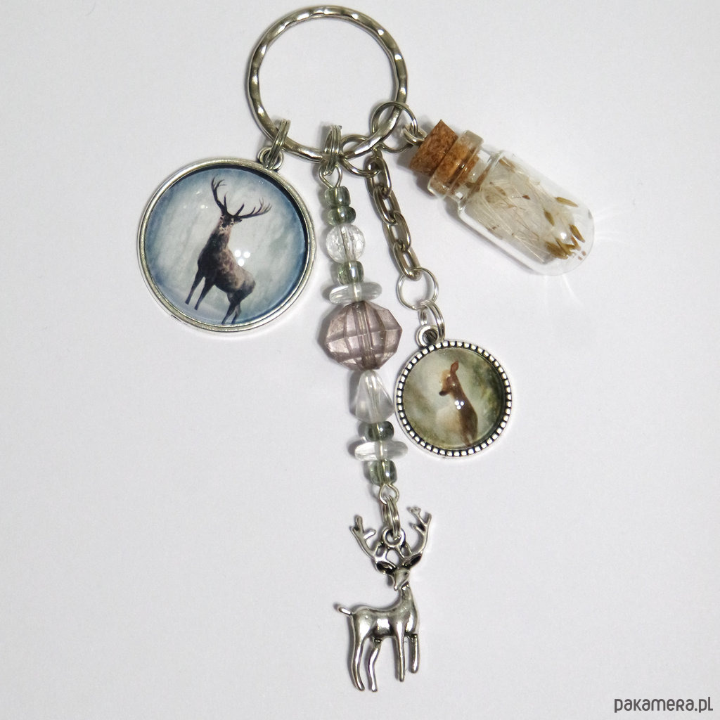 Niezwykły brelok z naszymi autorskimi grafikami, kompozycją z koralików, szklaną fiolką oraz zawieszką.